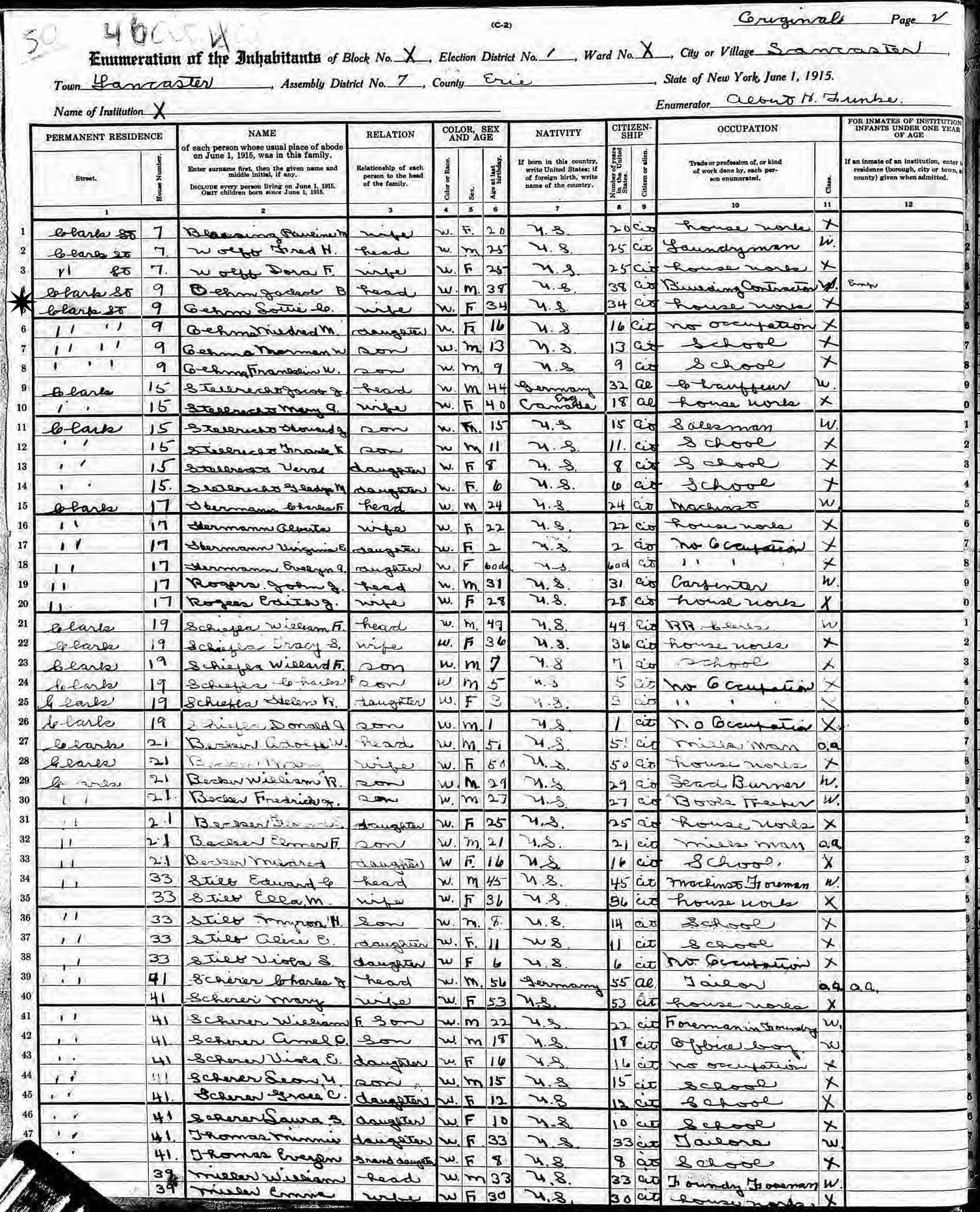 June 1, 1915 - New York State - 9 Clark Street, Election District 1, Assembly District 7, Lancaster, Erie County, New York.