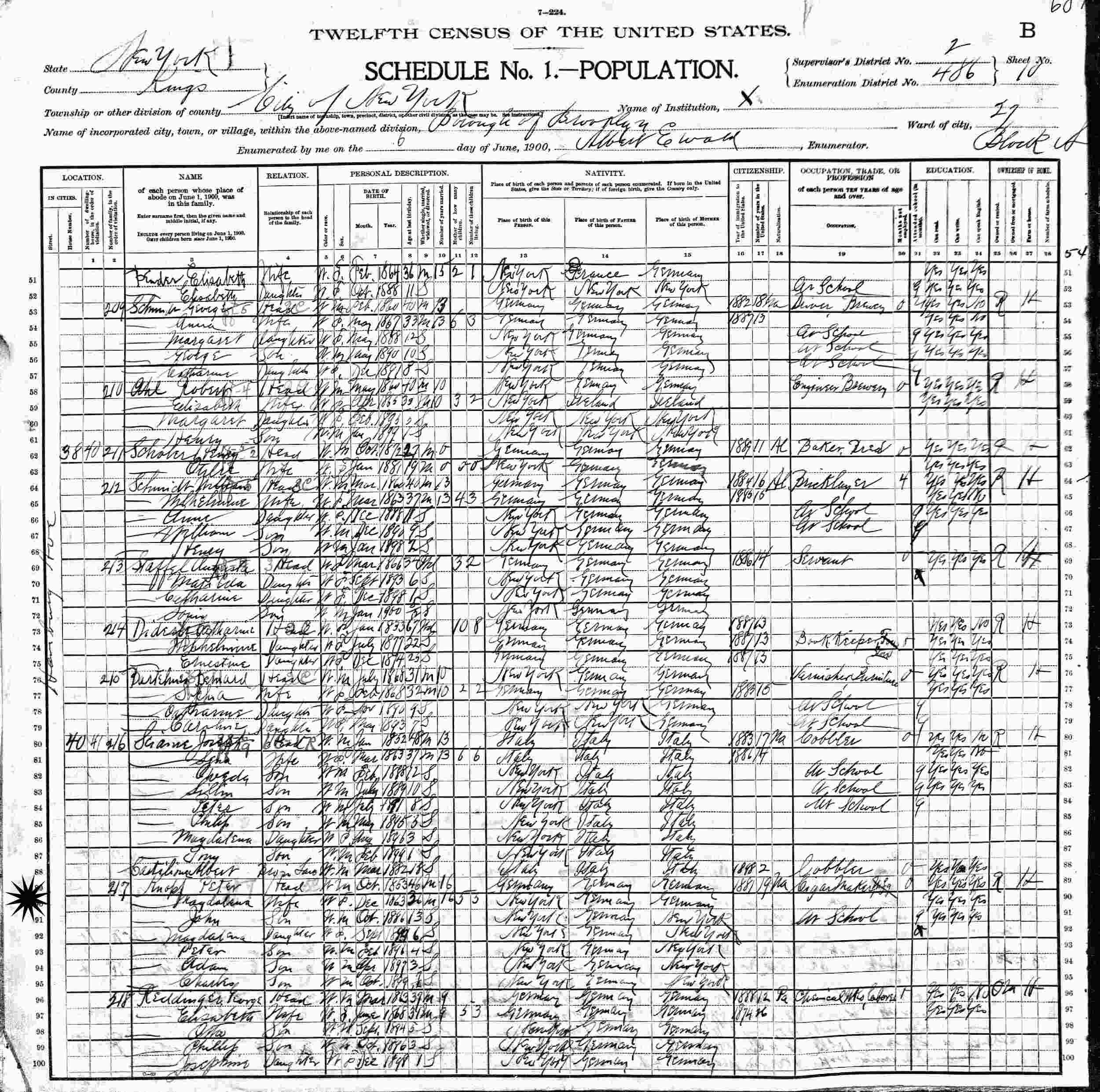 June 6, 1900 - 40 Hamburg Avenue, Block S, Ward 27, Supervisor's District 2, Enumeration District 486, Brooklyn, Kings County, New York.
