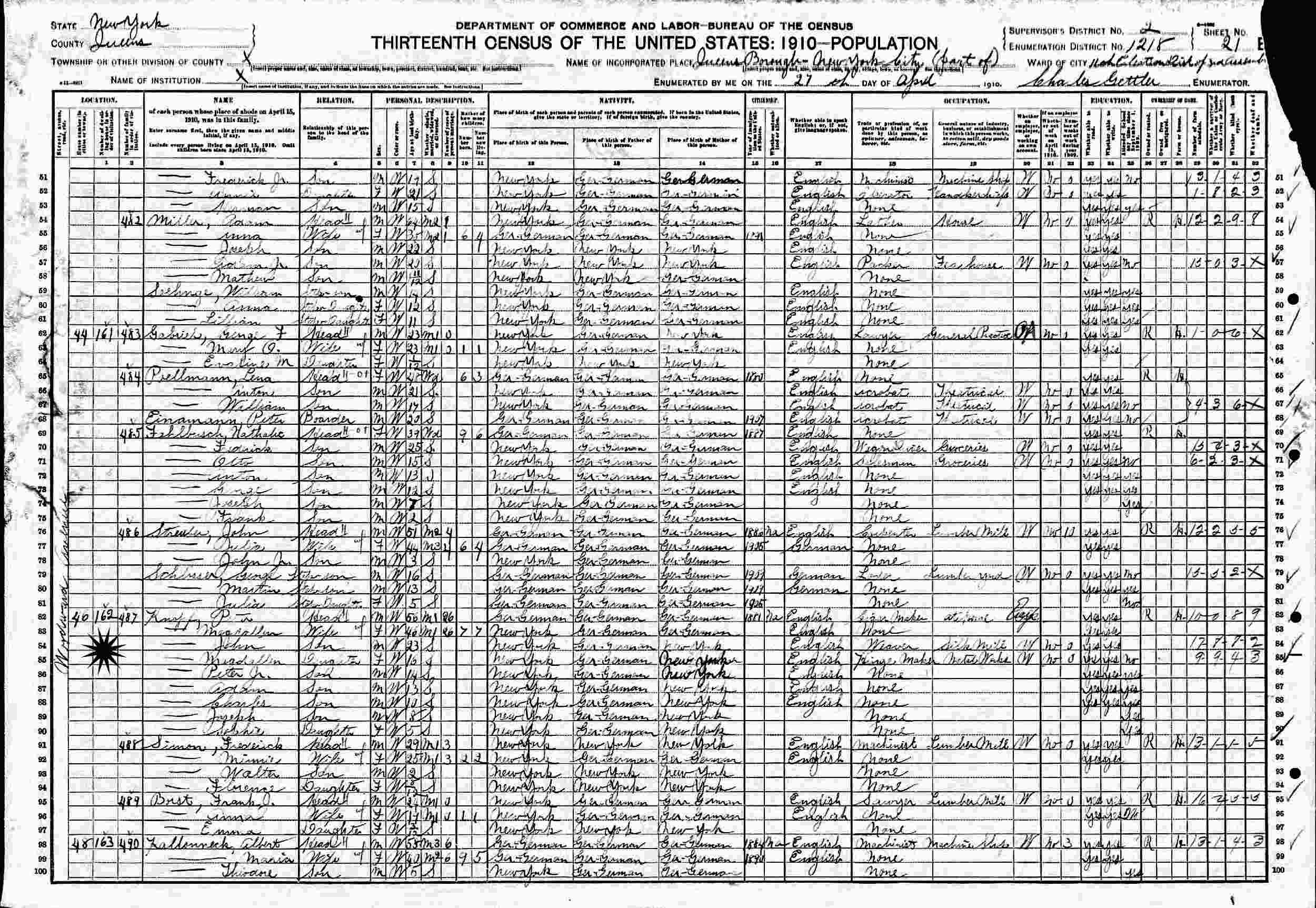 April 27, 1910 - 46 Woodward Avenue, Supervisor's District 12, Enumeration District 1218, Queens, New York City, New York.