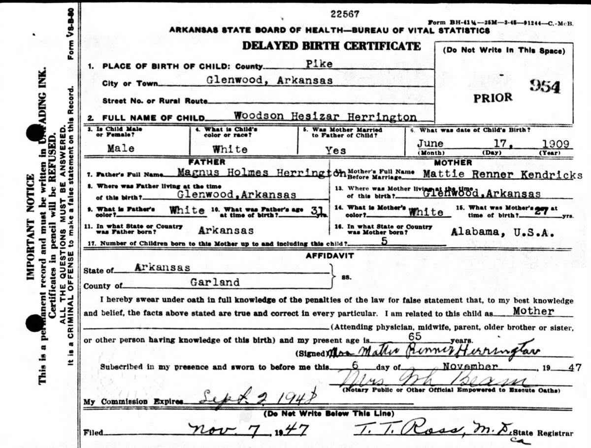 Born: June 17, 1909 in Glenwood, Pike County, Arkansas.