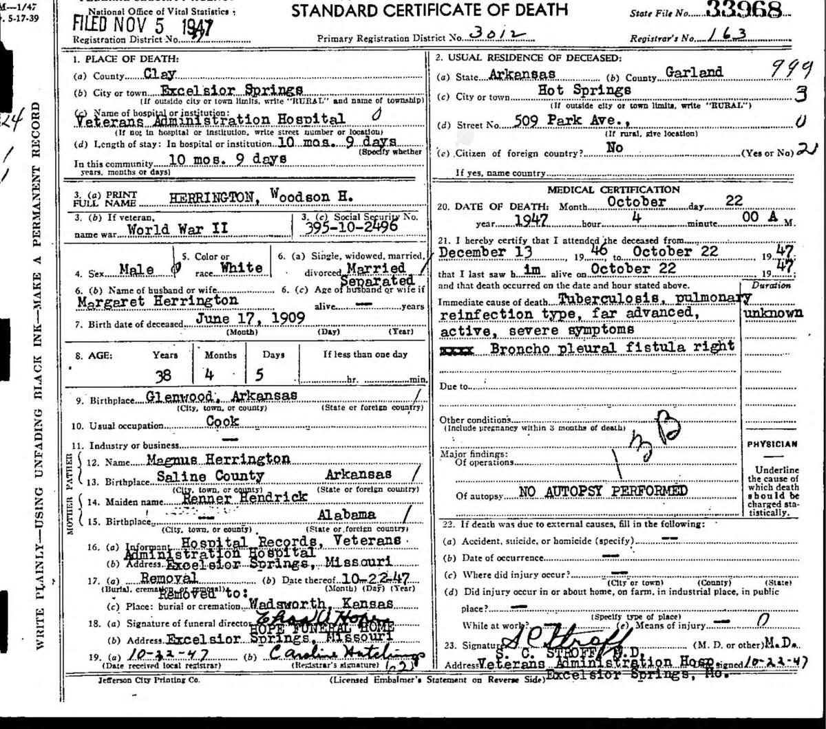 Last Residence: 509 Park Avenue, Hot Springs, Garland County, Arkansas.