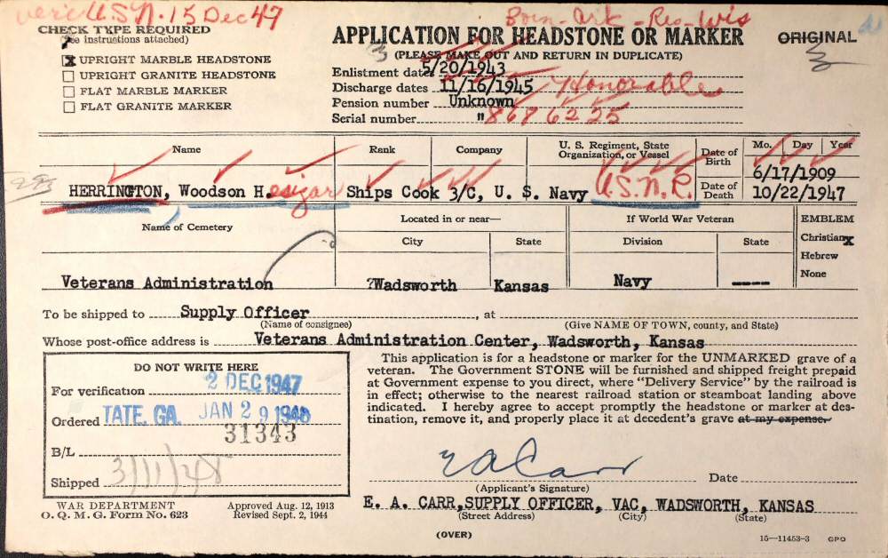 Buried: October 24, 1947 in Plot: Section 39, Row 16, Site 13; Leavenworth National Cemetery, Leavenworth, Leavenworth County, Kansas.