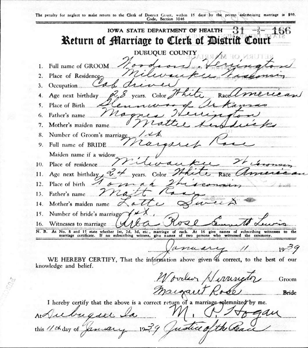 Married: Margaret Leona Rose January 11, 1939 in Dubuque, Dubuque County, Iowa. (Separated at time of Woodrow's death.)