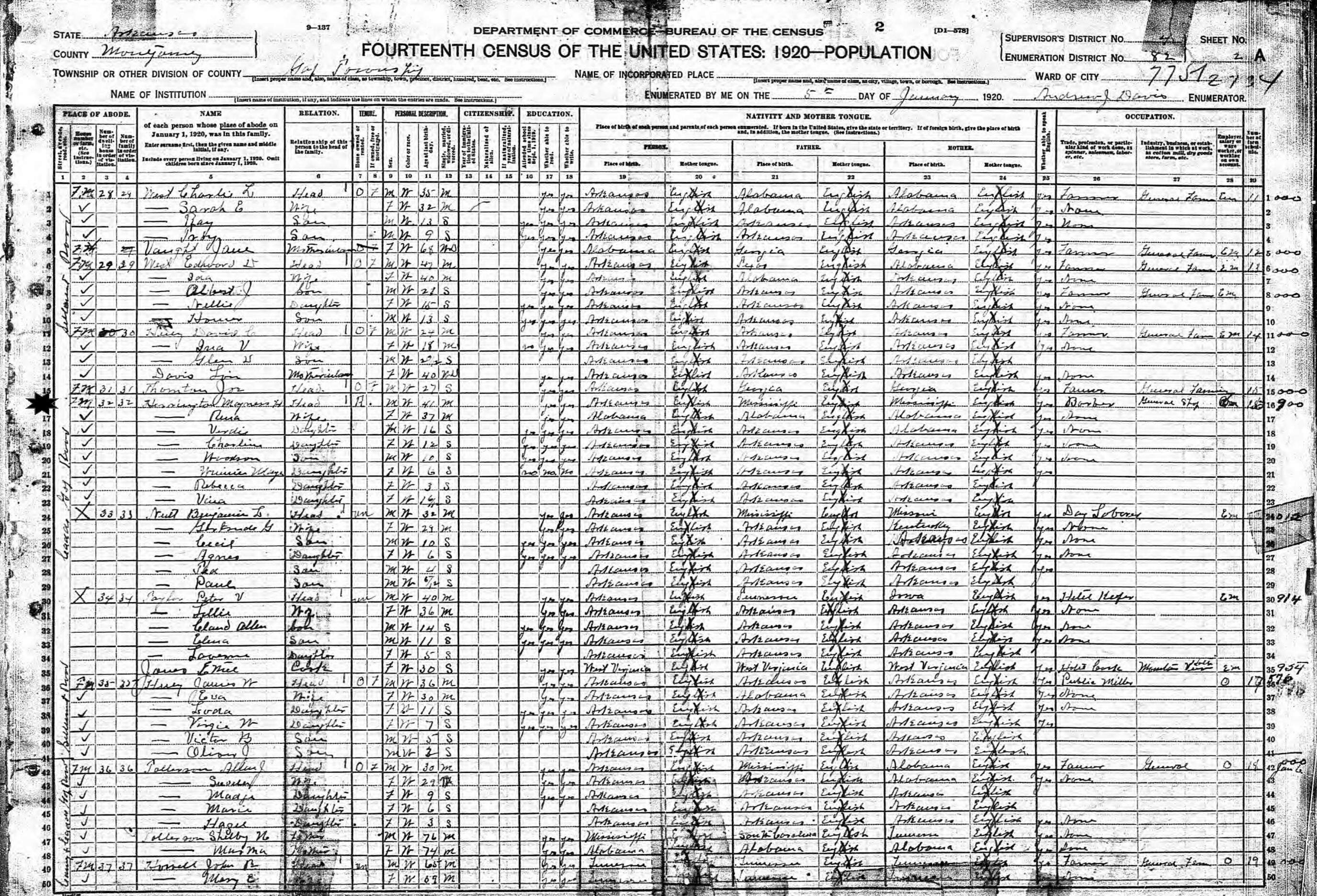 January 5, 1920 - Cadde Gap Road, Ward 77, Supervisor's District 4, Enumeration District 82, Gap Township, Montgomery County, Arkansas.