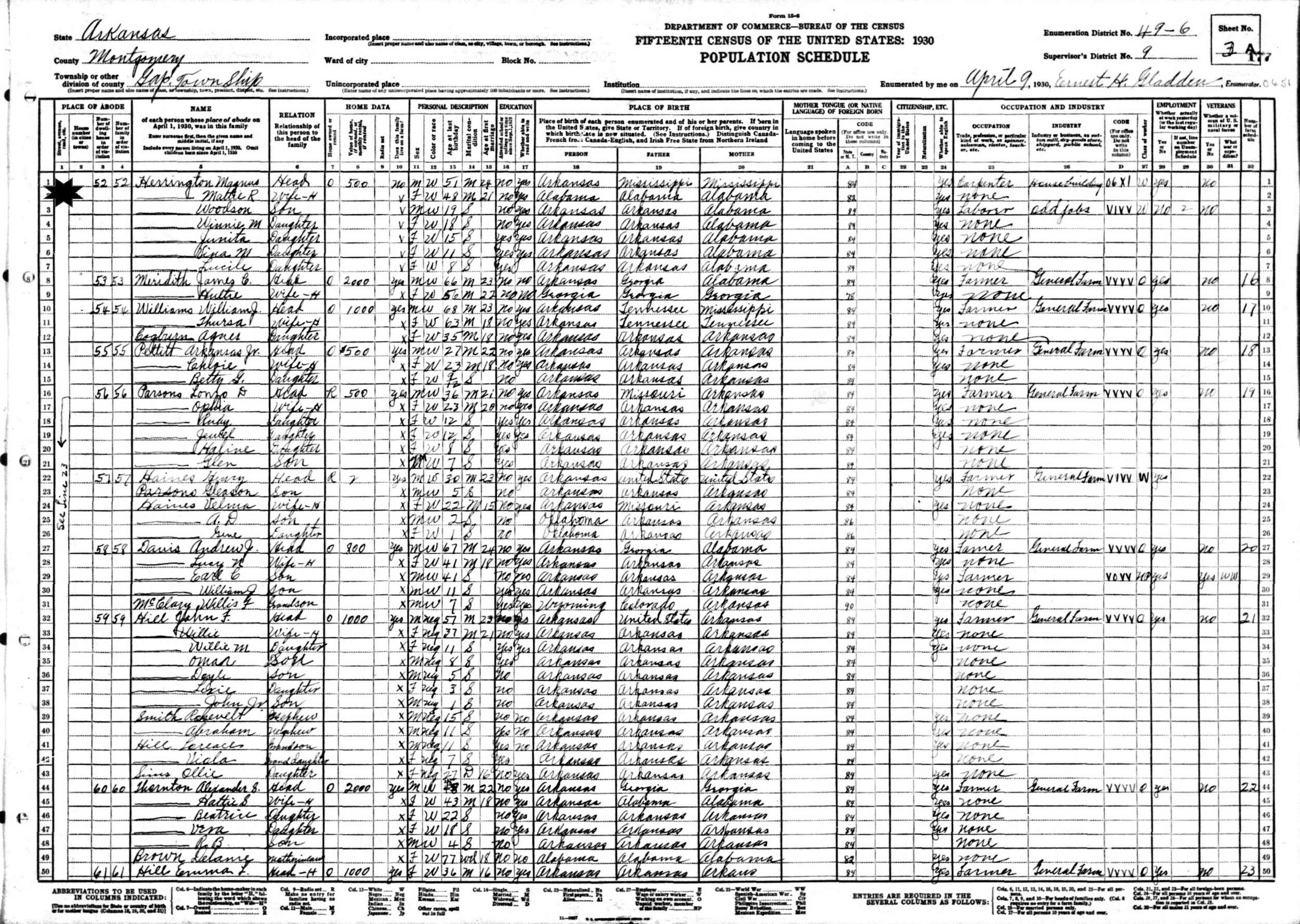 April 9, 1930 - Supervisor's District 9, Enumeration District 49-6, Gap Township, Montgomery County, Arkansas.