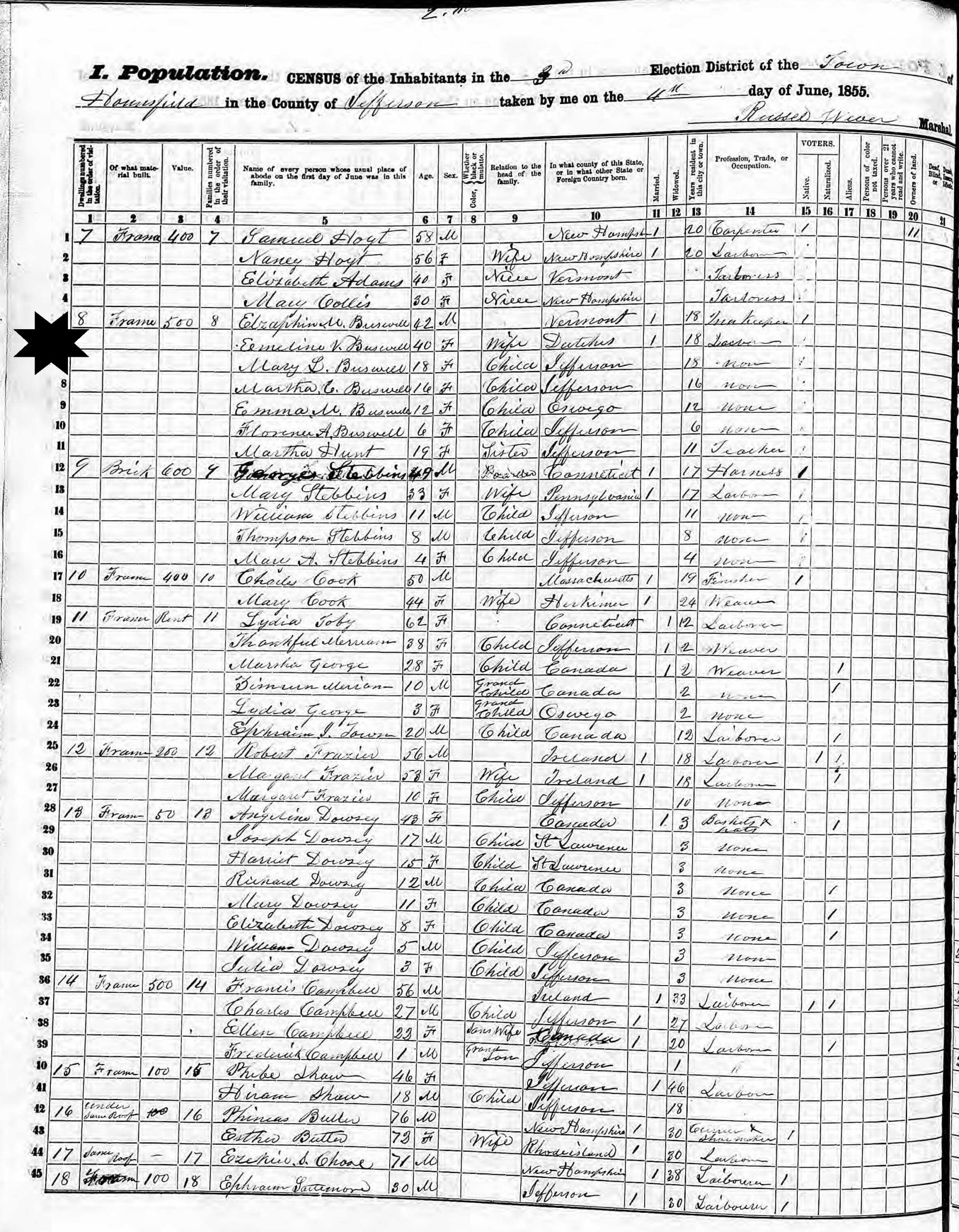 June 4, 1855 - New York State - Election District 3, Housefield, Jefferson County, New York.