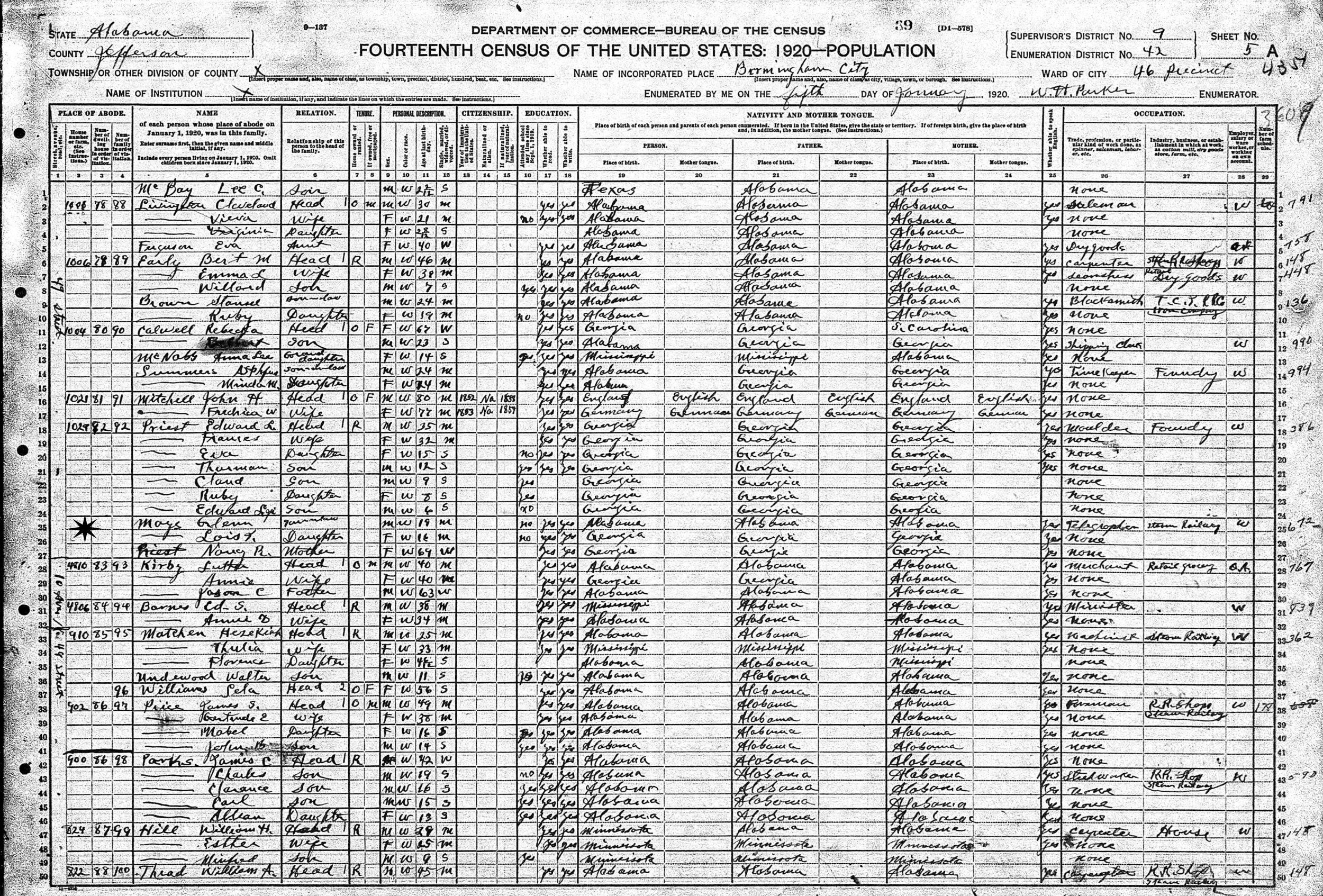 January 5, 1920 - 1029 49th Street, 46th Precinct, Supervisor's District 9, Enumeration District 42, Birmingham, Jefferson County, Alabama (w/parents).