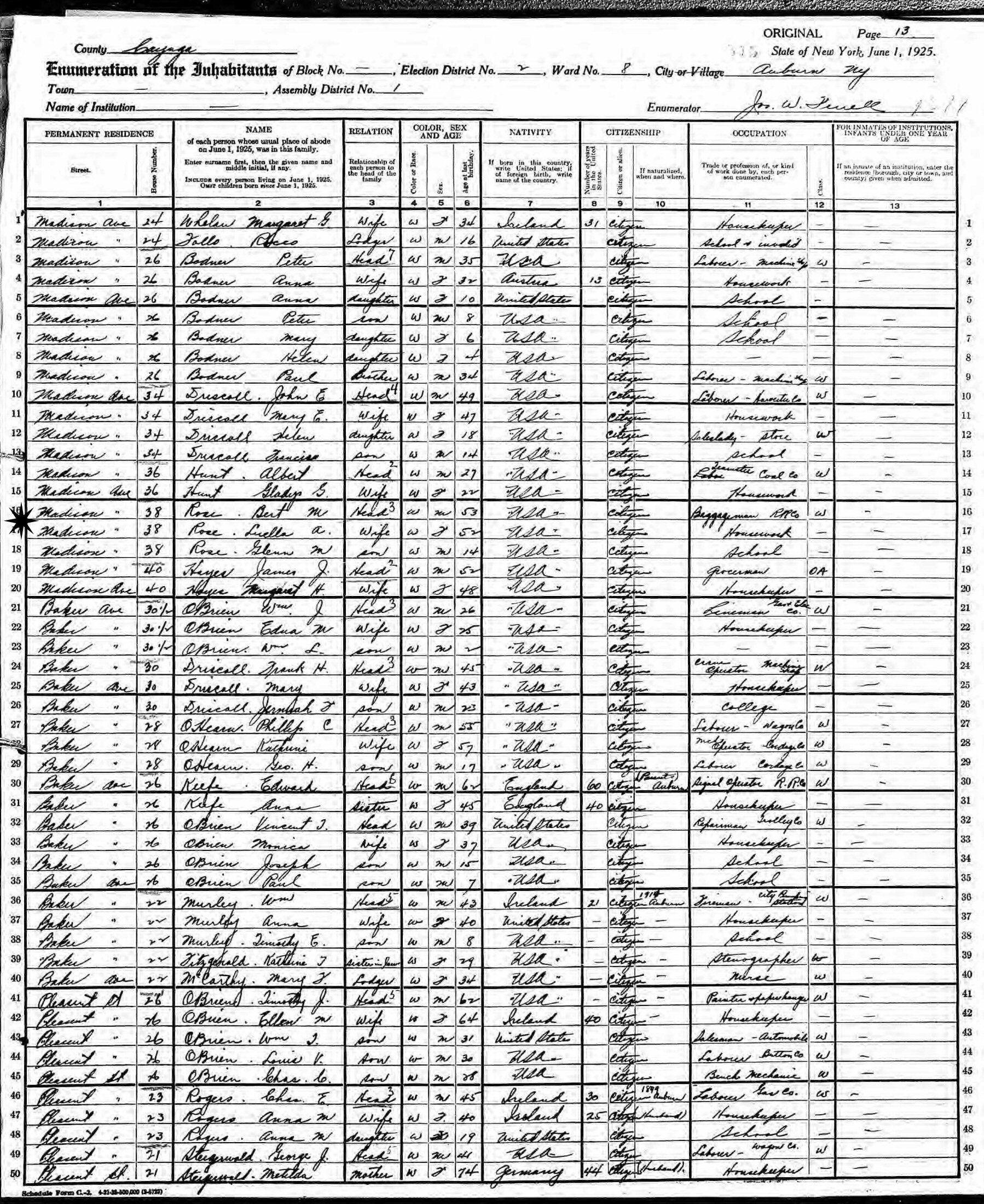 June 1, 1925 - New York State Census - 38 Madison Avenue, Election District 2, Assembly District 1, Ward 8, Auburn, Cayuga County, New York.