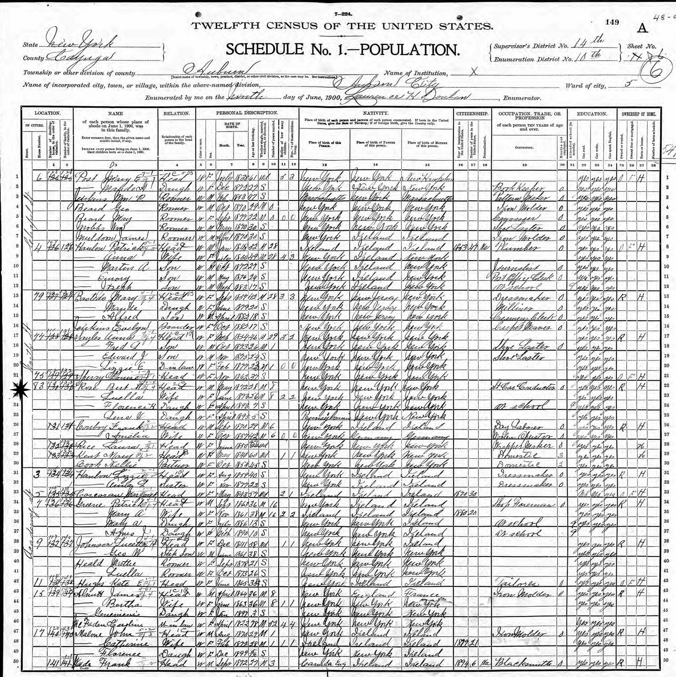 June 9, 1900 - 83 North Street, Supervisor's District 14, Enumeration District 10, Auburn, Cayuga County, New York.