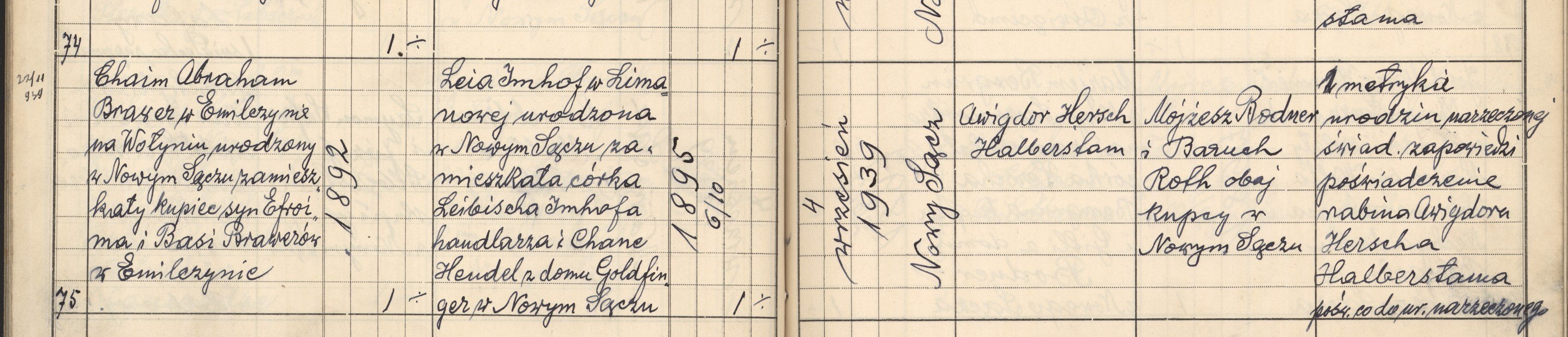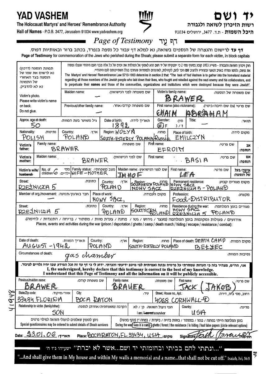 Chaim Abraham Brawer was born in Emilchin, Ukraine (USSR), 1892 to Efroim and Basia. He was a food dealer and married to Lea nee Imhof. Prior to WWII he lived in Nowy Sacz, Poland. During the war he was in Nowy Sacz, Poland.