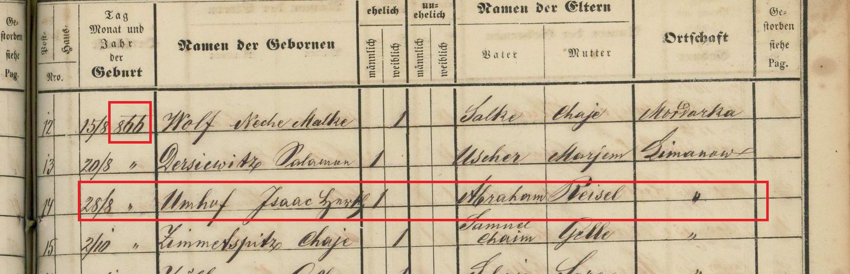 Notes for ISAAC HIRSCH UMHOF: Son of Abraham and Reisel (Fink) Umhof. Born: August 28, 1866 in Limanowa, Poland. Died: Unknown in Unknown.