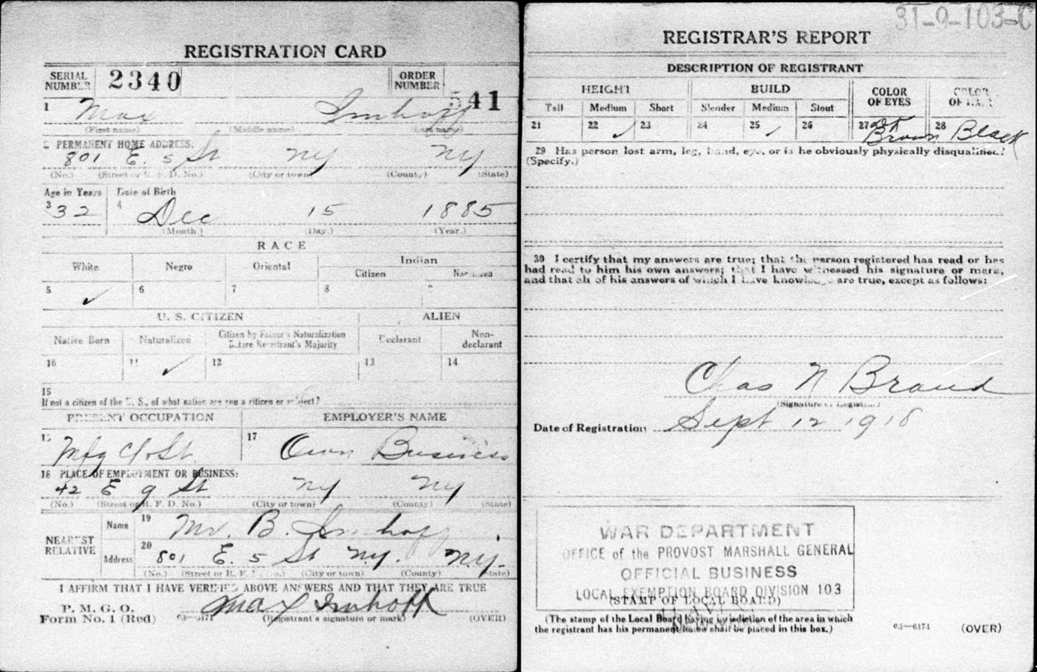 September 12, 1918 - 801 E 5th Street, New York City, New York.