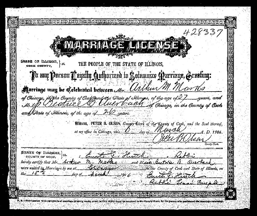 Married: Beatrice "Birdie" Auerbach March 15, 1906 in Chicago, Cook County, Illinois.