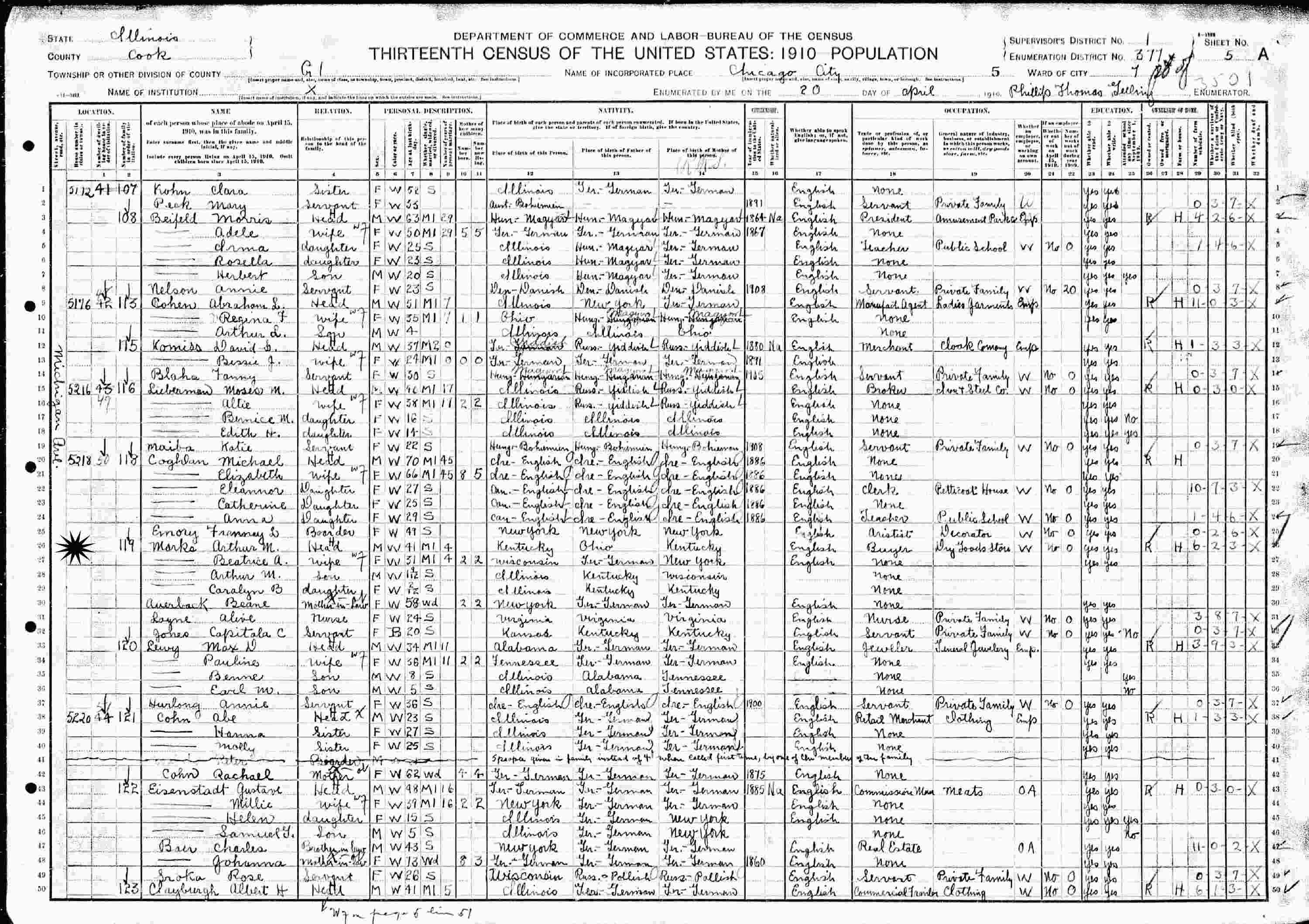 April 20, 1910 - 5218 Michigan Avenue, Ward 7, Supervisor's District 1, Enumeration District 377, Chicago, Cook County, Illinois.
