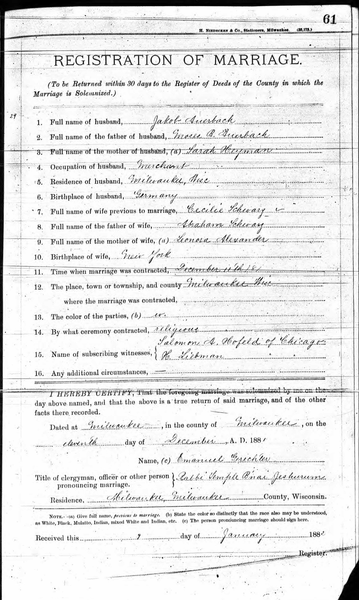 Married: Celia Schwarz December 11, 1881 in Milwaukee, Milwaukee County, Wisconsin.