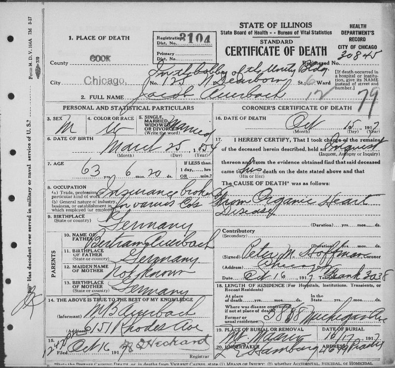 Died: October 15, 1917 in Chicago, Cook County, Illinois.