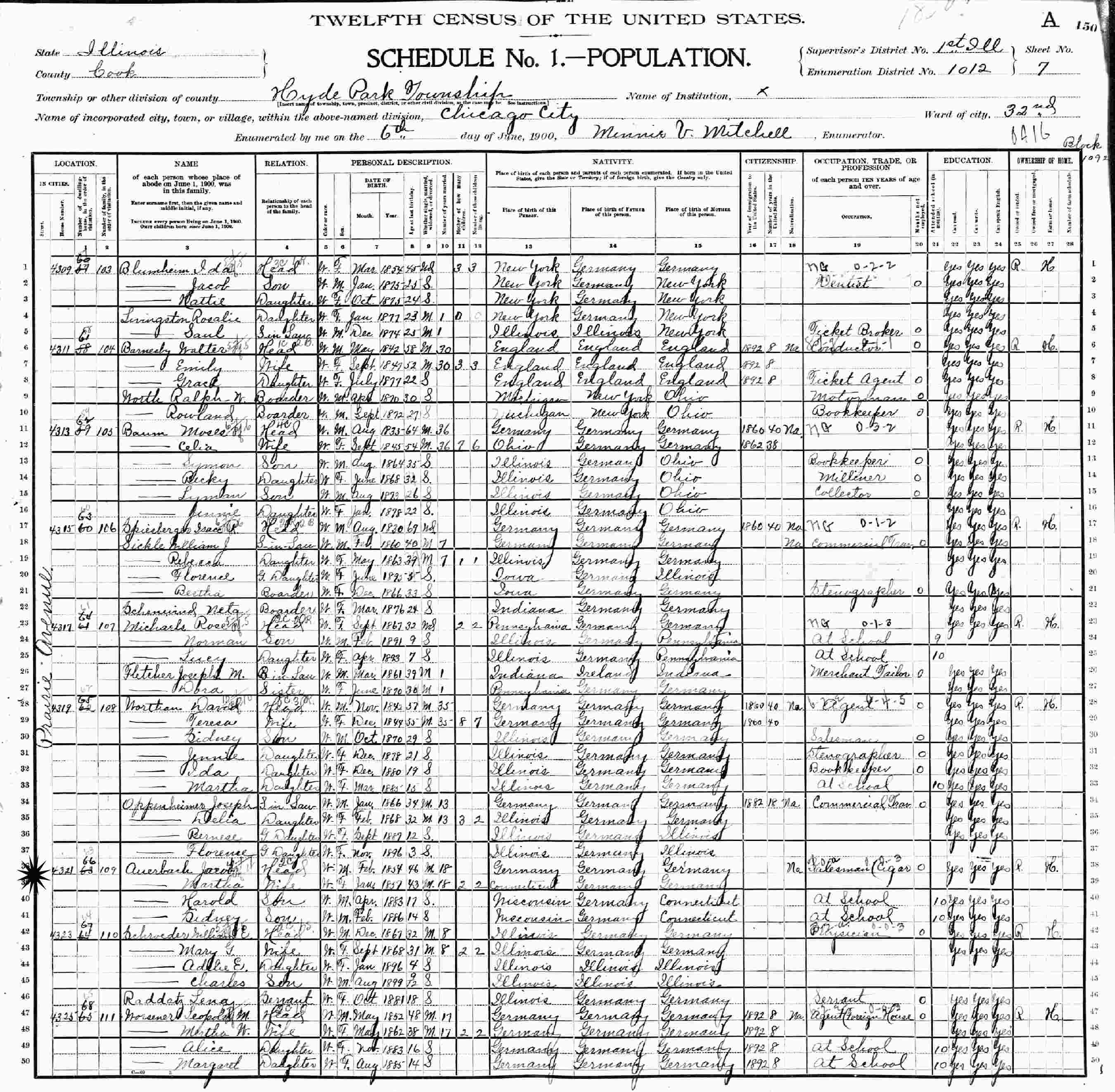 June 6, 1900 - 4321 Prairie Avenue, Hyde Park Township, Ward 32, Supervisor's District 1, Enumeration District 1012, Chicago, Cook County, Illinois.