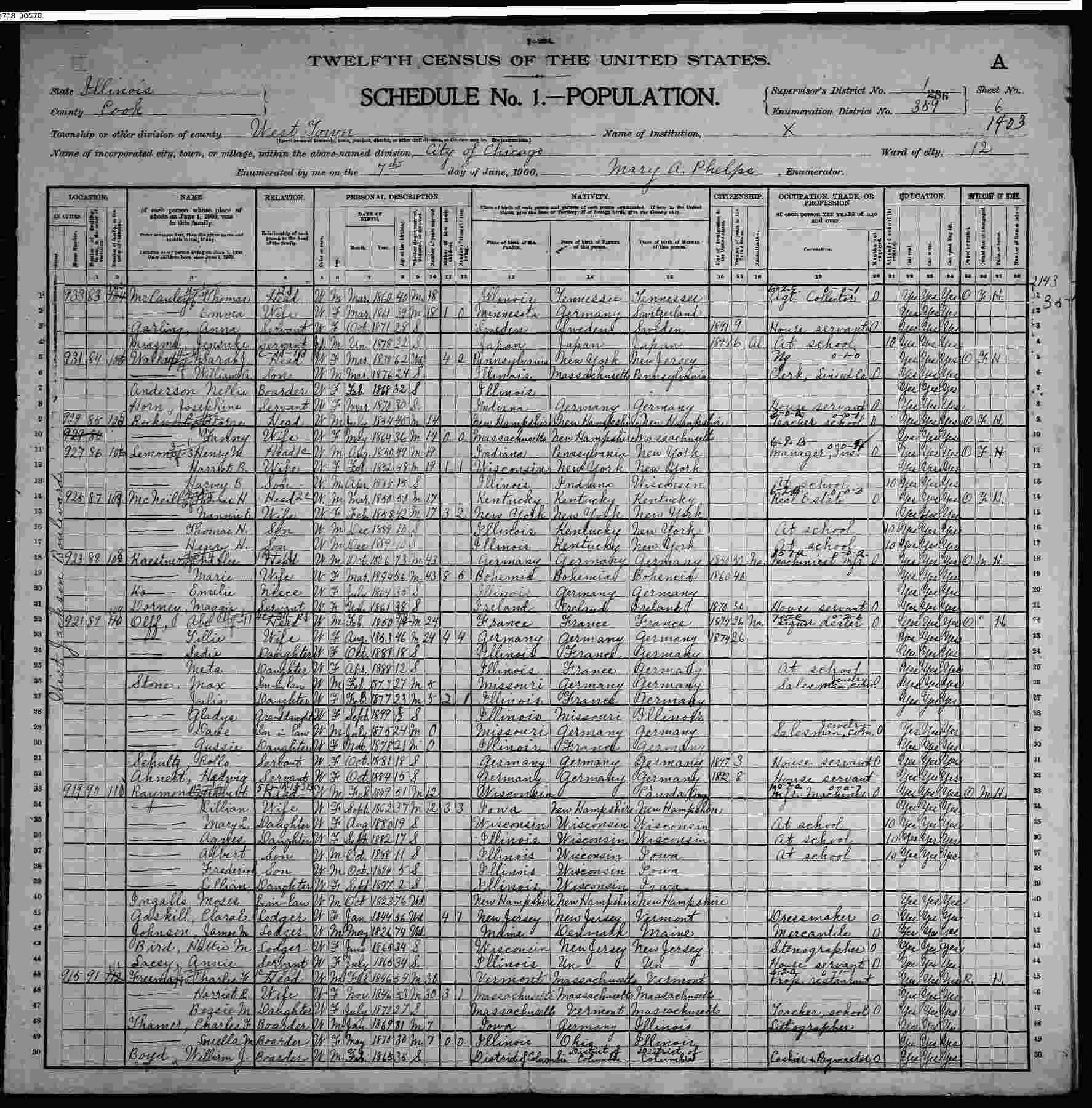 June 7, 1900 - 921 West Jackson Boulevard, Ward 12, West Town, Supervisor's District 1, Enumeration District 359, Chicago, Cook County, Illinois.