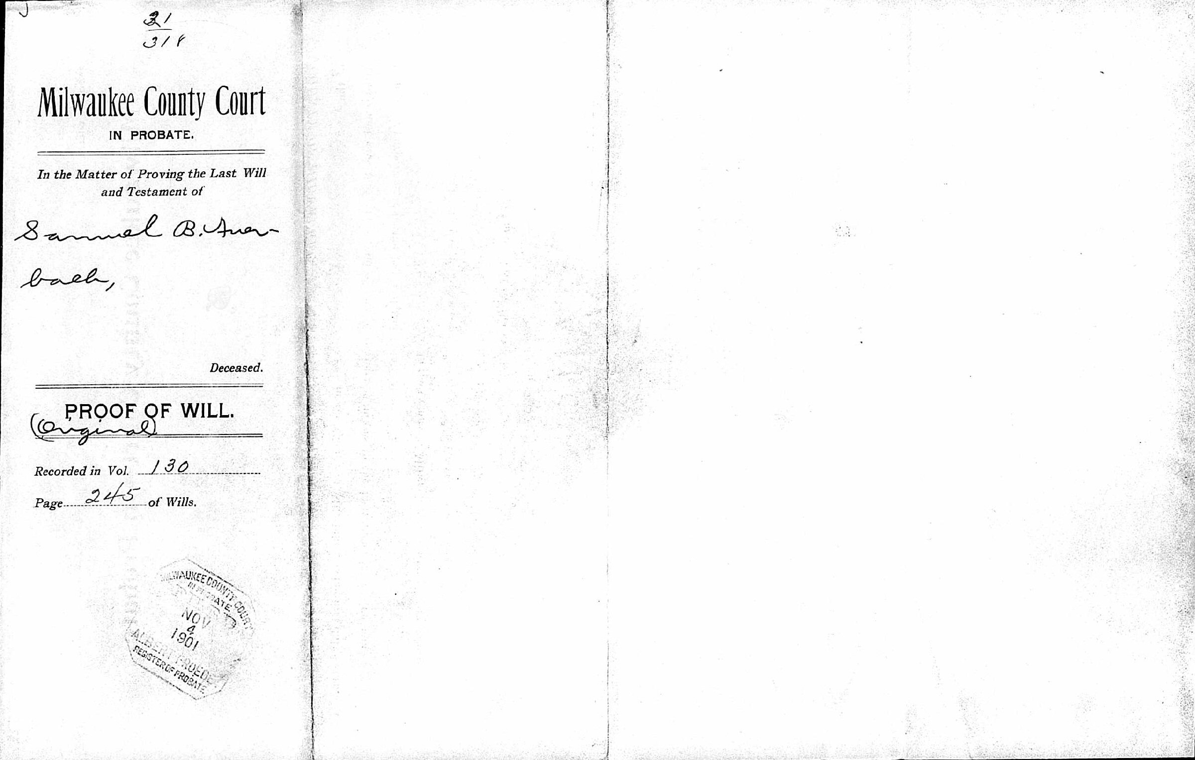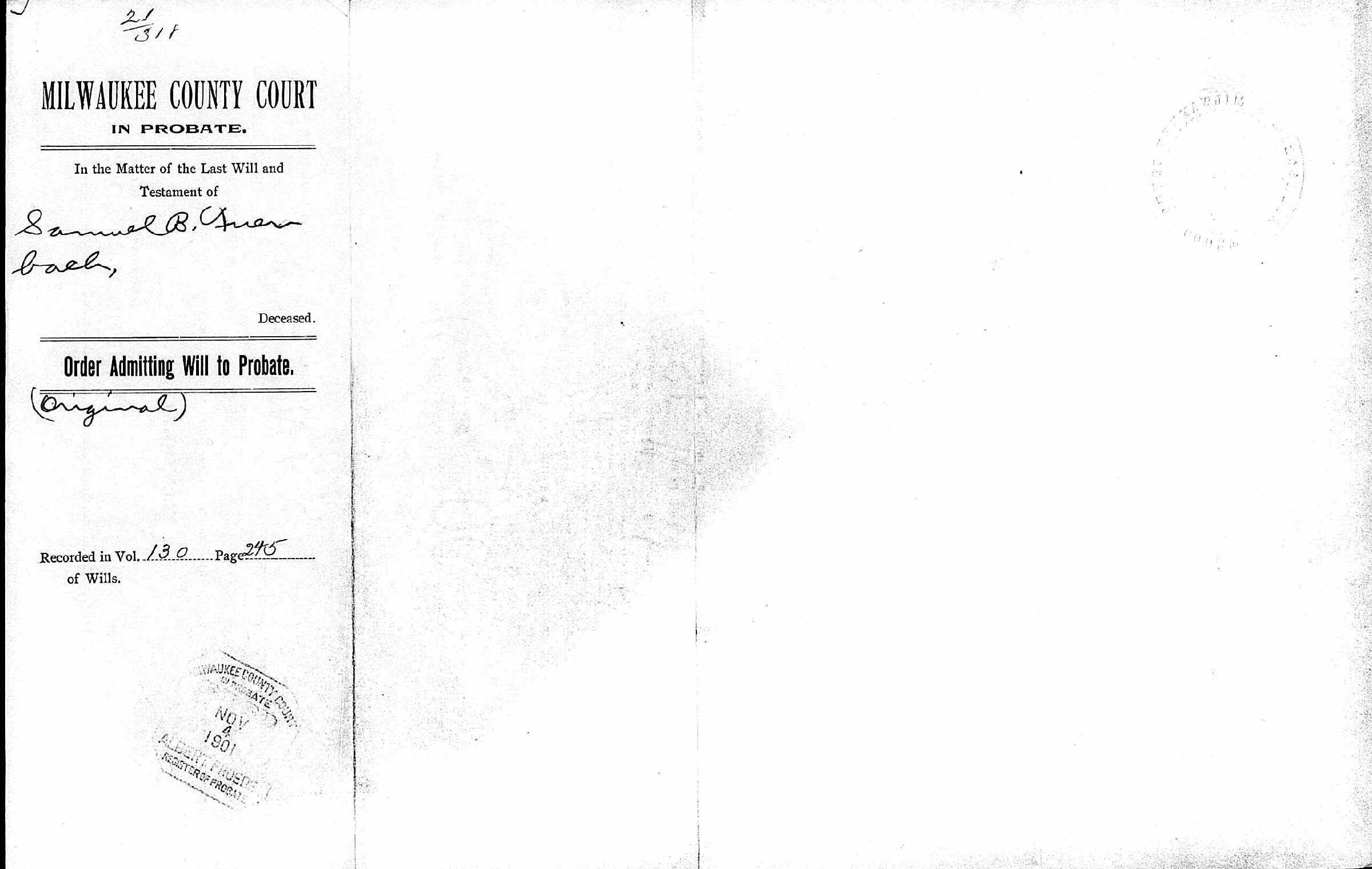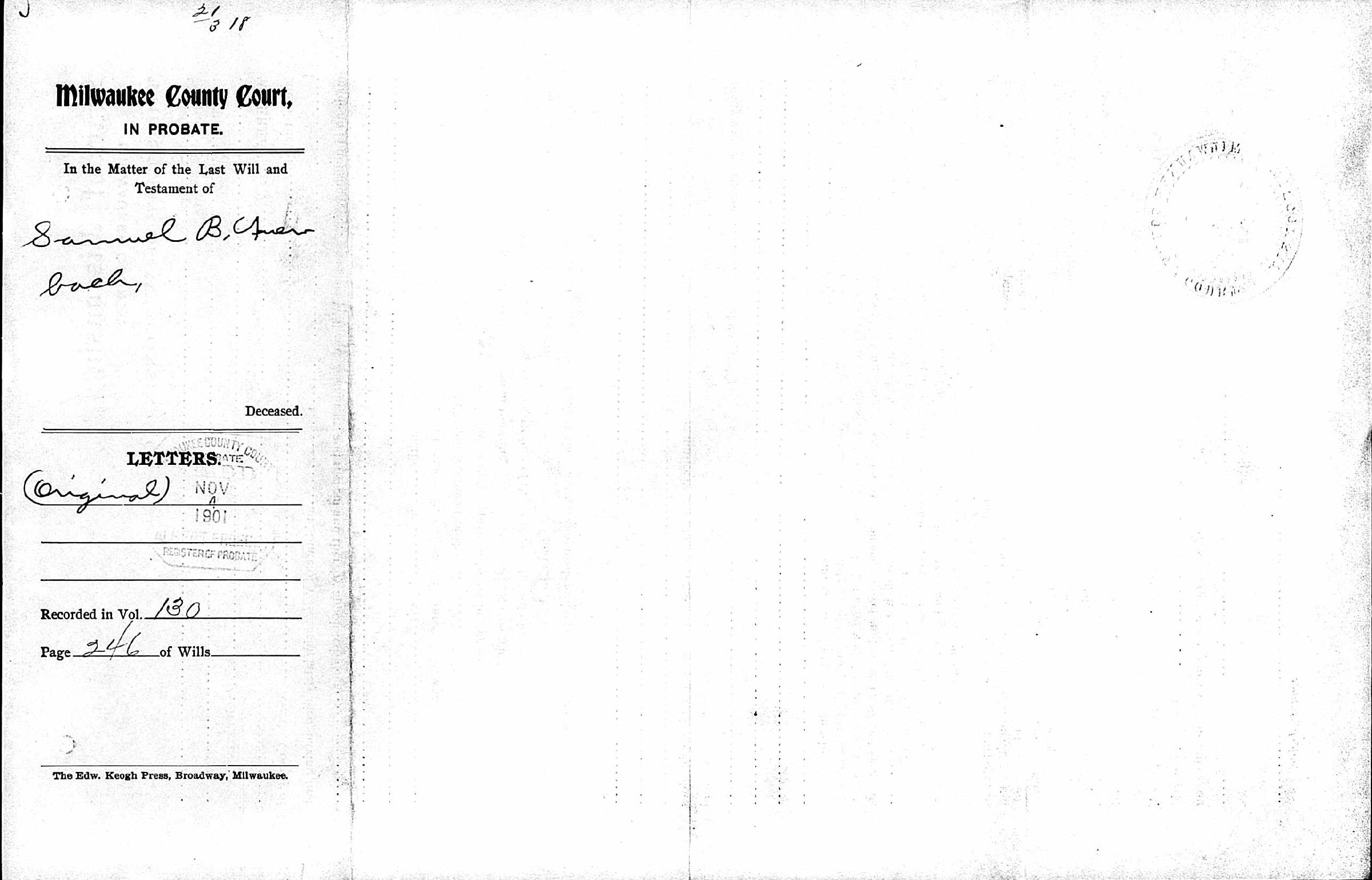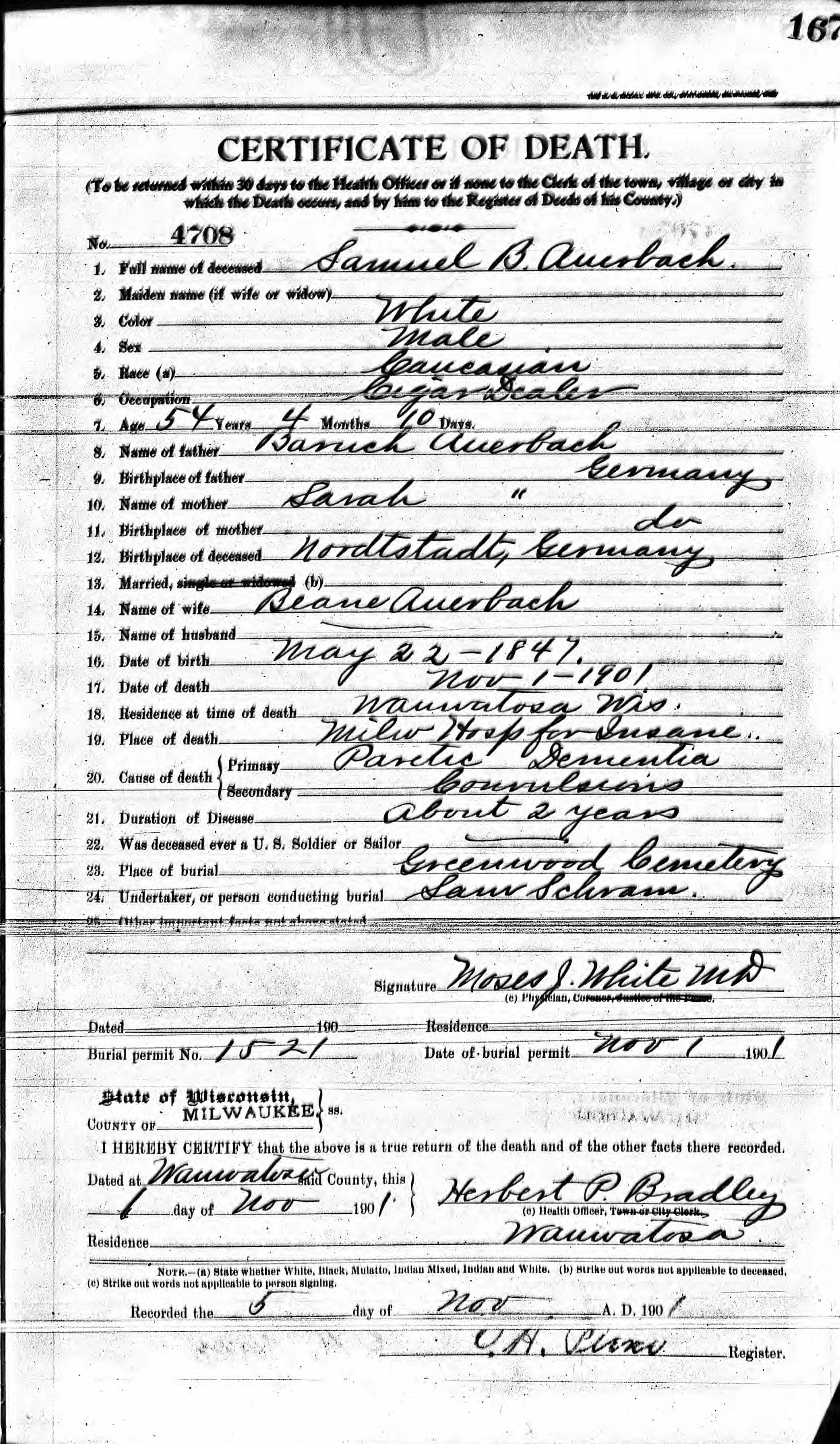 Died: November 1, 1901 in Milwaukee Hospital for Insane, Wauwatosa, Milwaukee County, Wisconsin.
