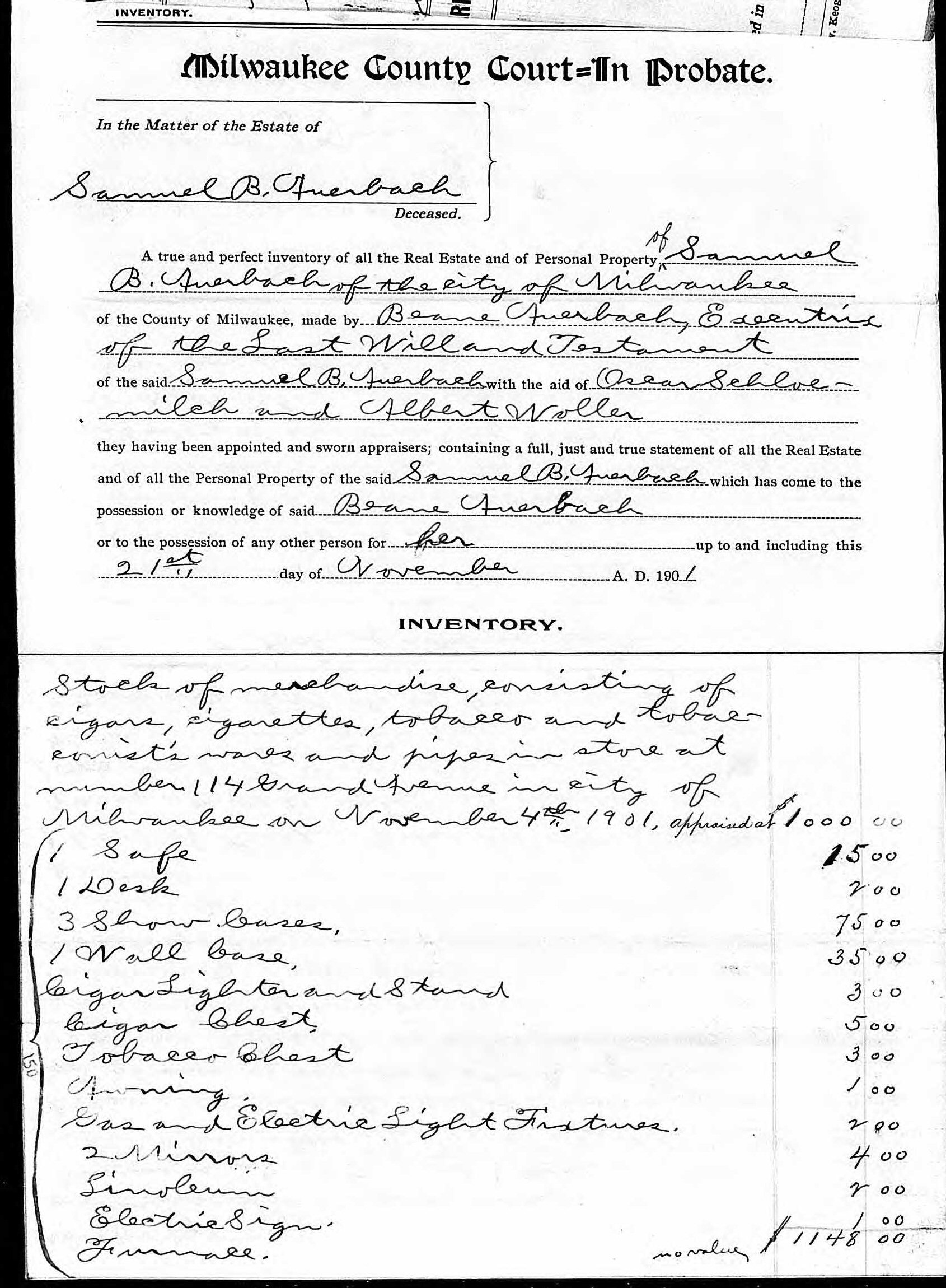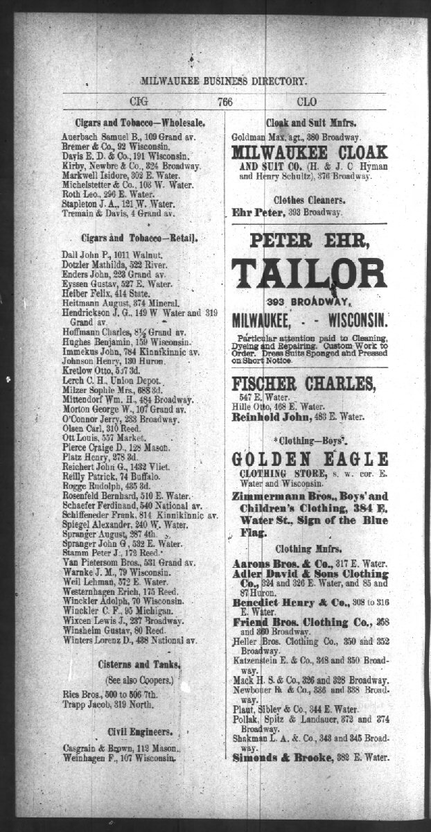 1884 - Wholesaler of Cigars and Tobacco 109 Grand Ave Milwaukee, Wisconsin.