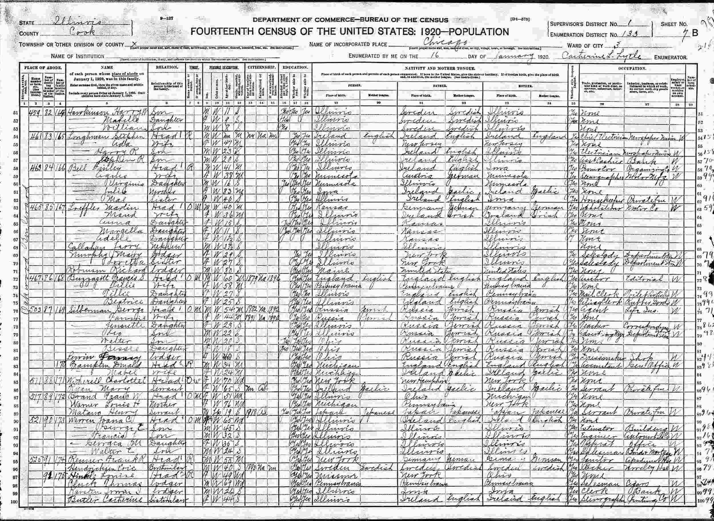 January 16, 1920 - 503 Oakwood Boulevard, Ward 3, Supervisor's District 1, Enumeration District 133, Chicago, Cook County, Illinois.