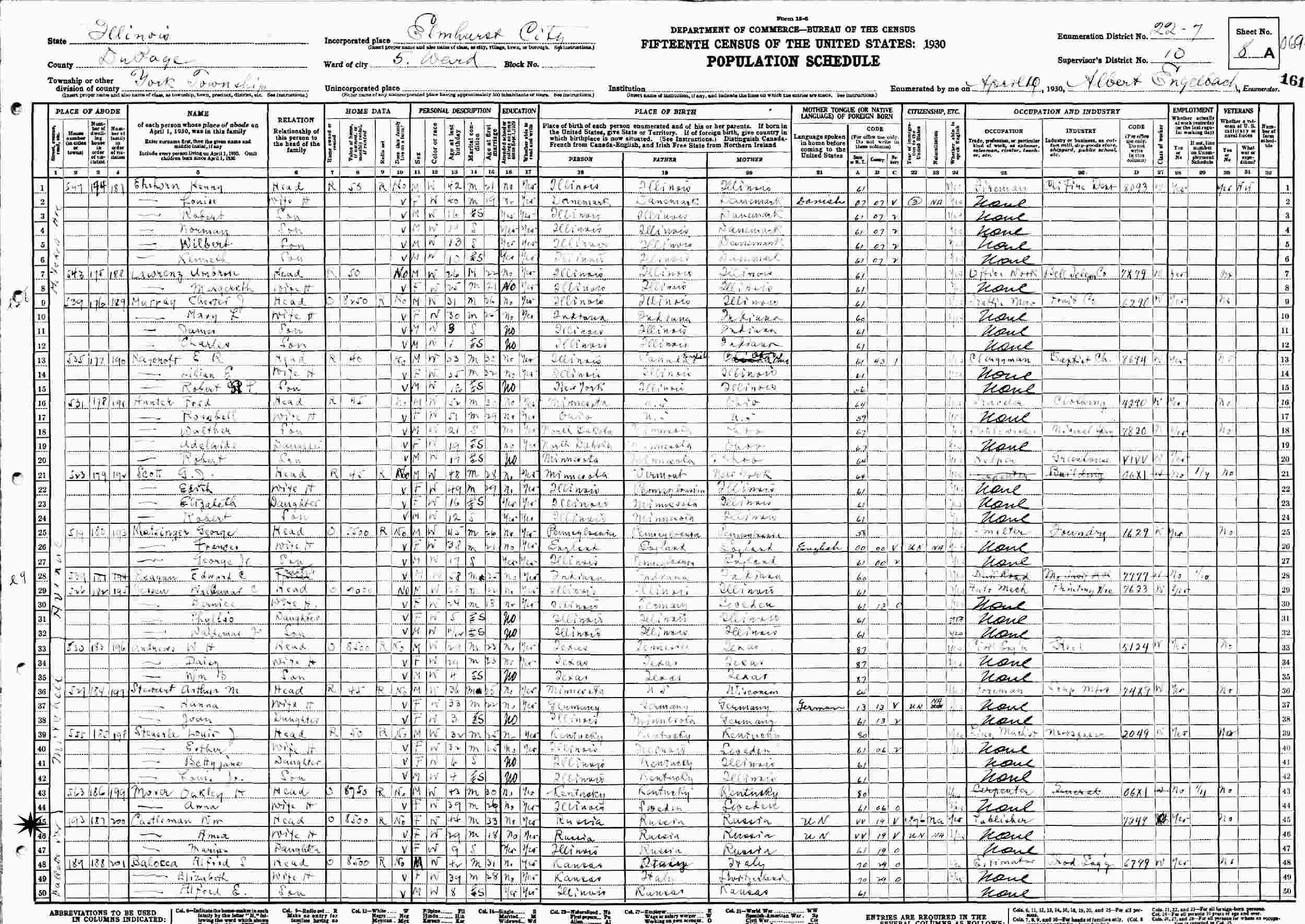 April 10, 1930 - 193 Vallette Street, Ward 5, Supervisor's District 10, Enumeration District 22-7, York Township, Elmhurst City, DuPage County, Illinois.