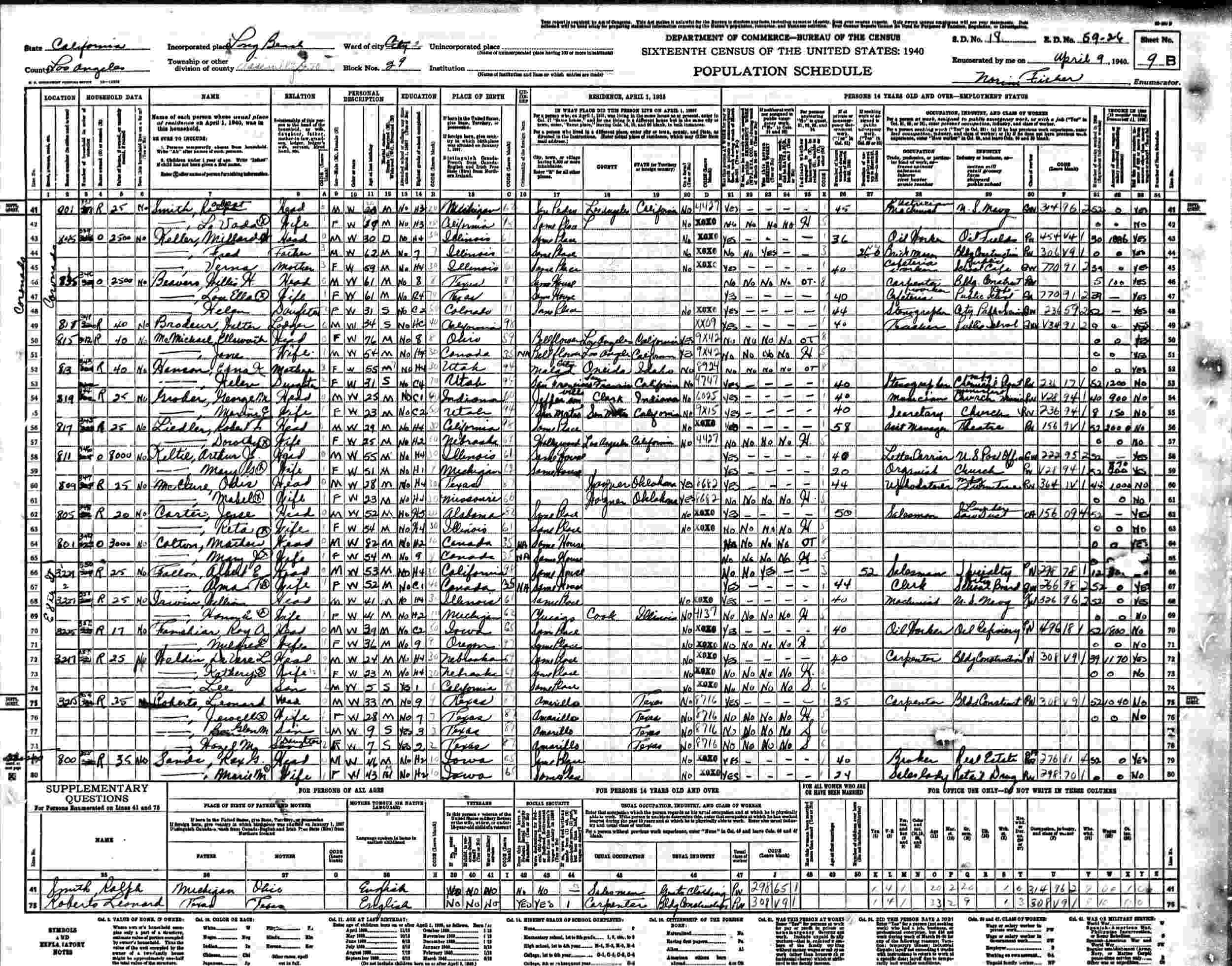 April 9, 1940 - 344 Coronado, Assembly District 70, Ward 2, Block 29, Supervisor's District 18, Enumeration District 59-26, Long Beach, Los Angeles County, California.