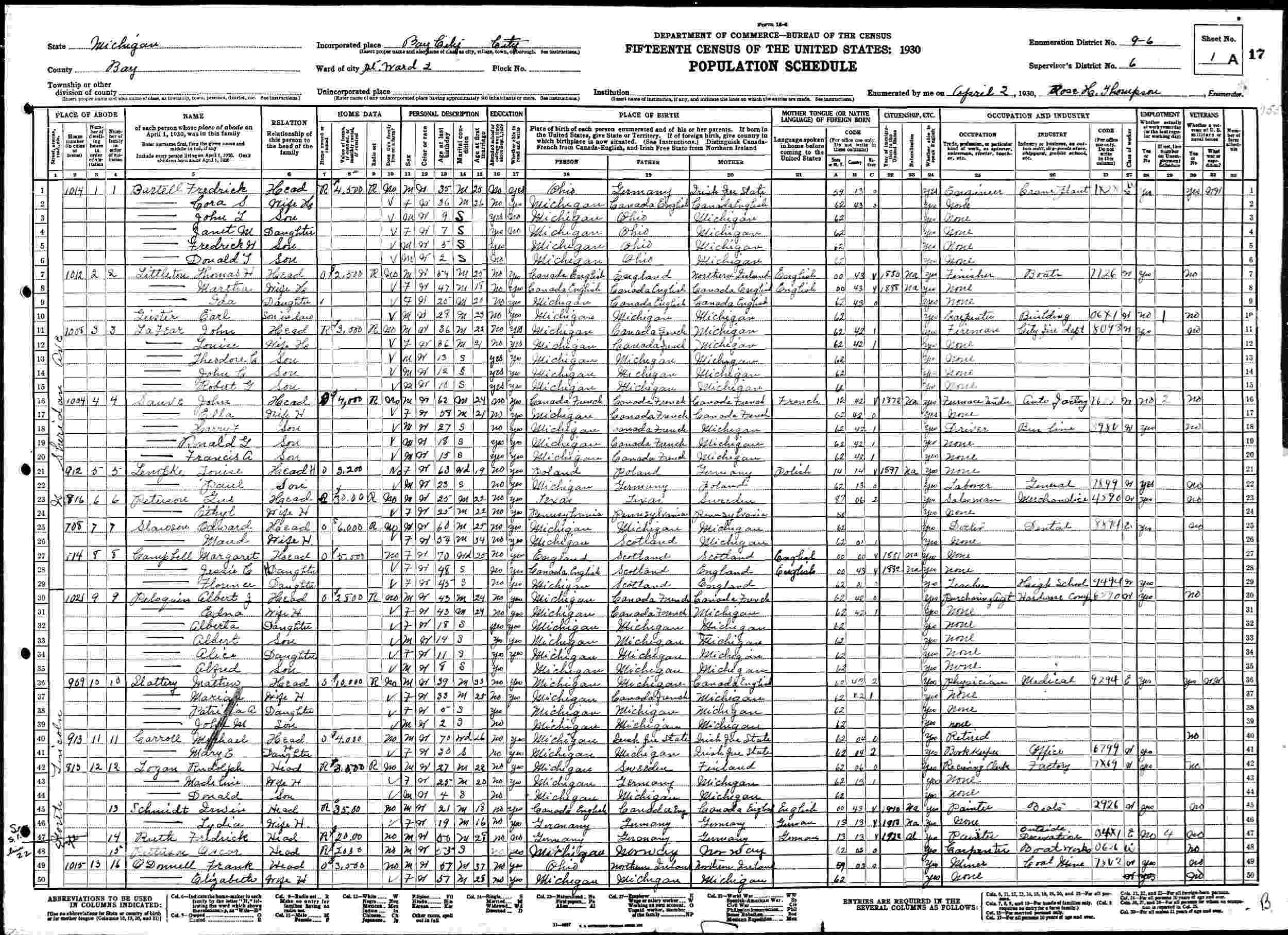 April 2, 1930 - 969 North Lincoln, Ward 2, Supervisor's District 6, Enumeration District 9-6, Bay City, Bay County, Michigan.