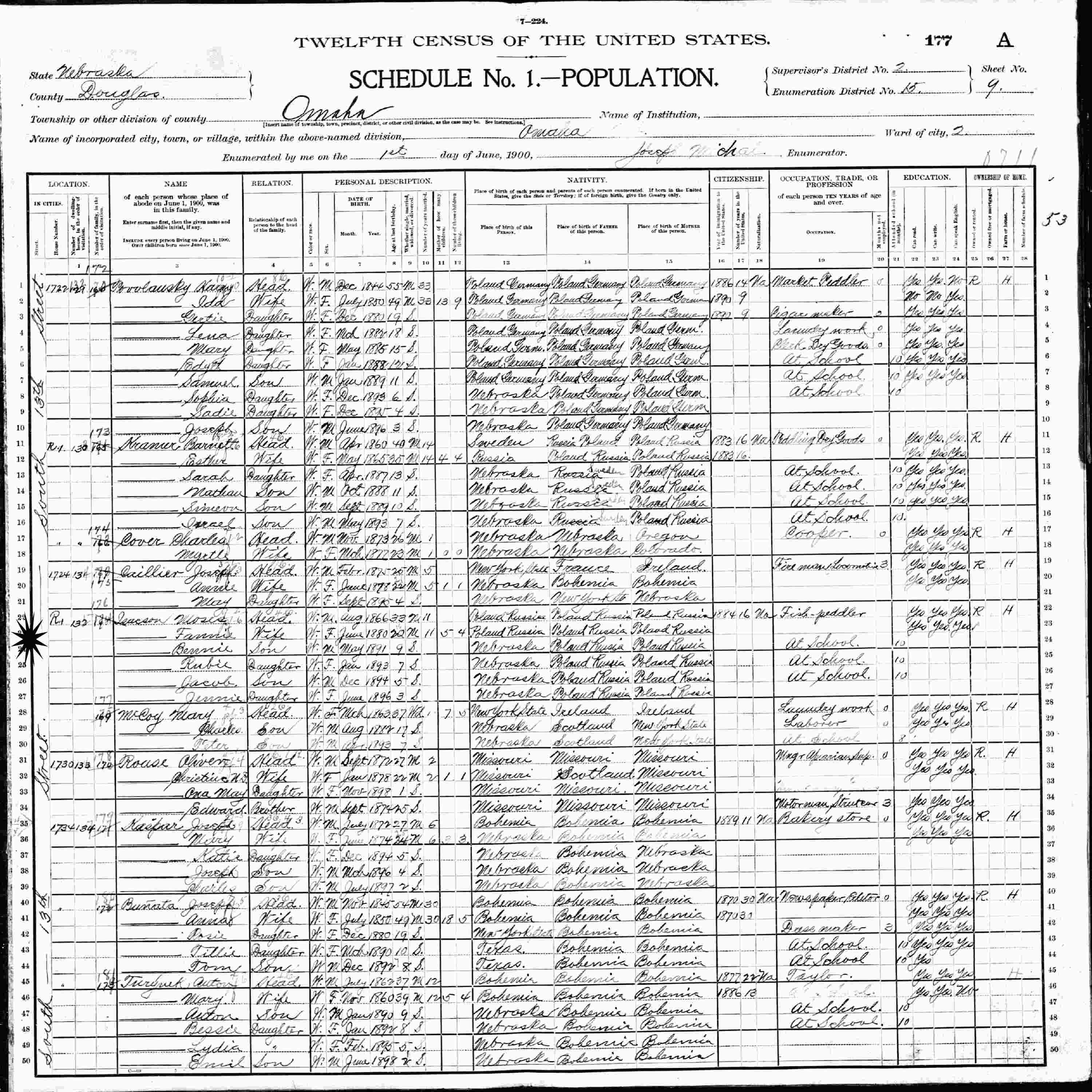June 1, 1900: 1724 (Rear) South 13th Avenue, Ward 2, Omaha, Supervisor's District 2, Enumeration District 15, Douglas County, Nebraska.