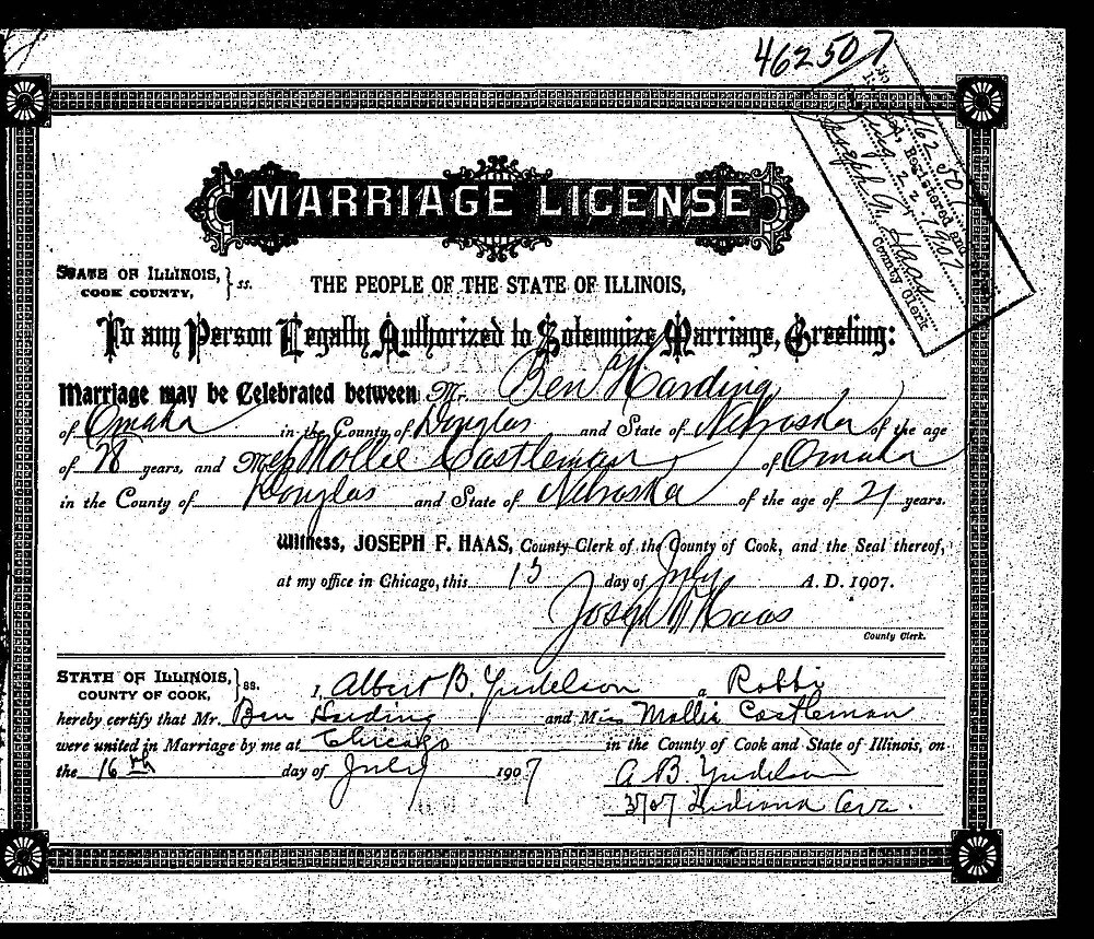Married: Ben Harding July 16, 1907 in Chicago, Cook County, Illinois.