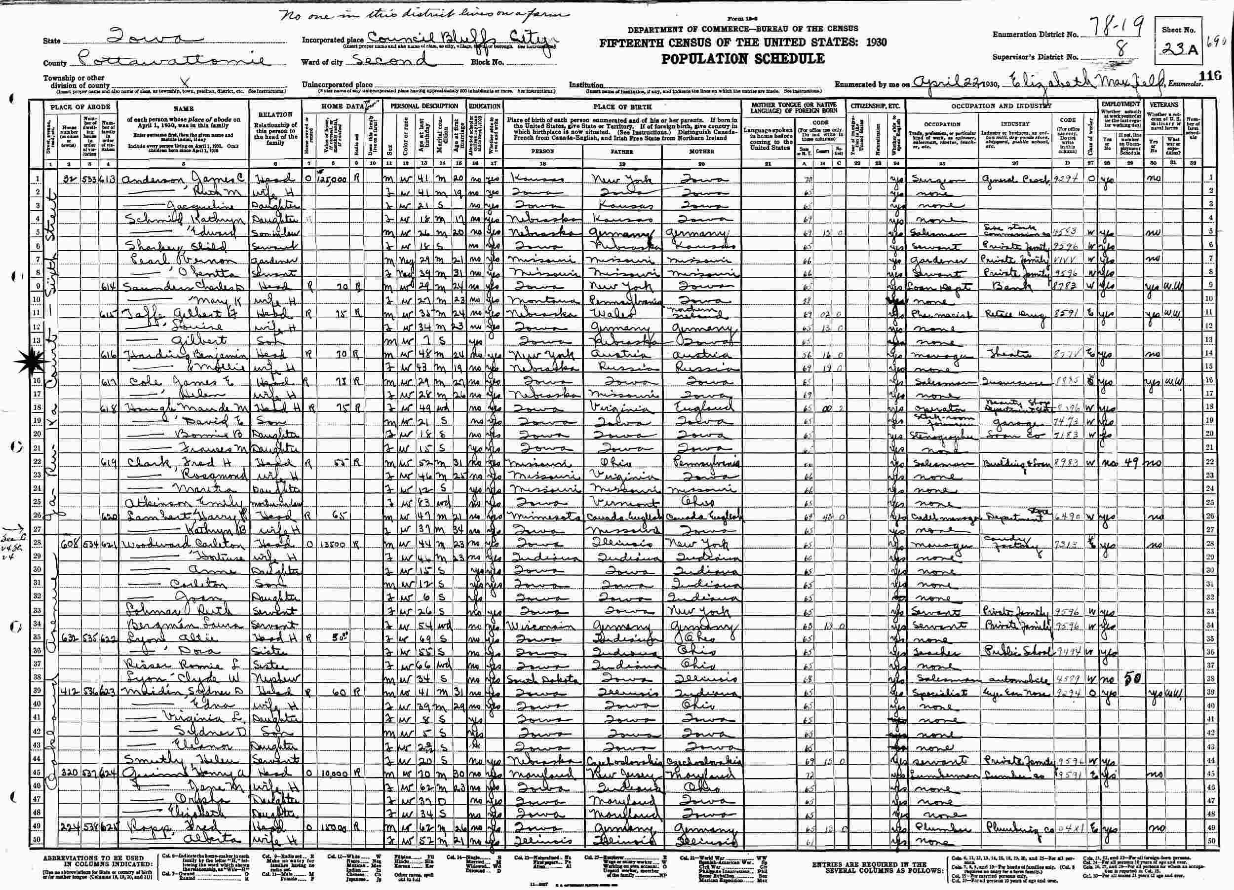 April 22, 1930 - Ja-Ru-Ka Court/Sixth Street, Ward 2, Supervisor's District 8, Enumeration District 78-19, Council Bluffs, Pottawattamie, Iowa.