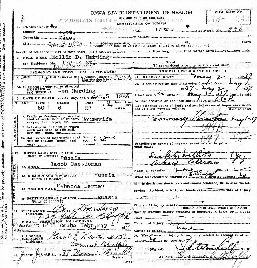 Died: May 2, 1937 in Kane Township, Council Bluffs, Pottawamie County, Iowa.
