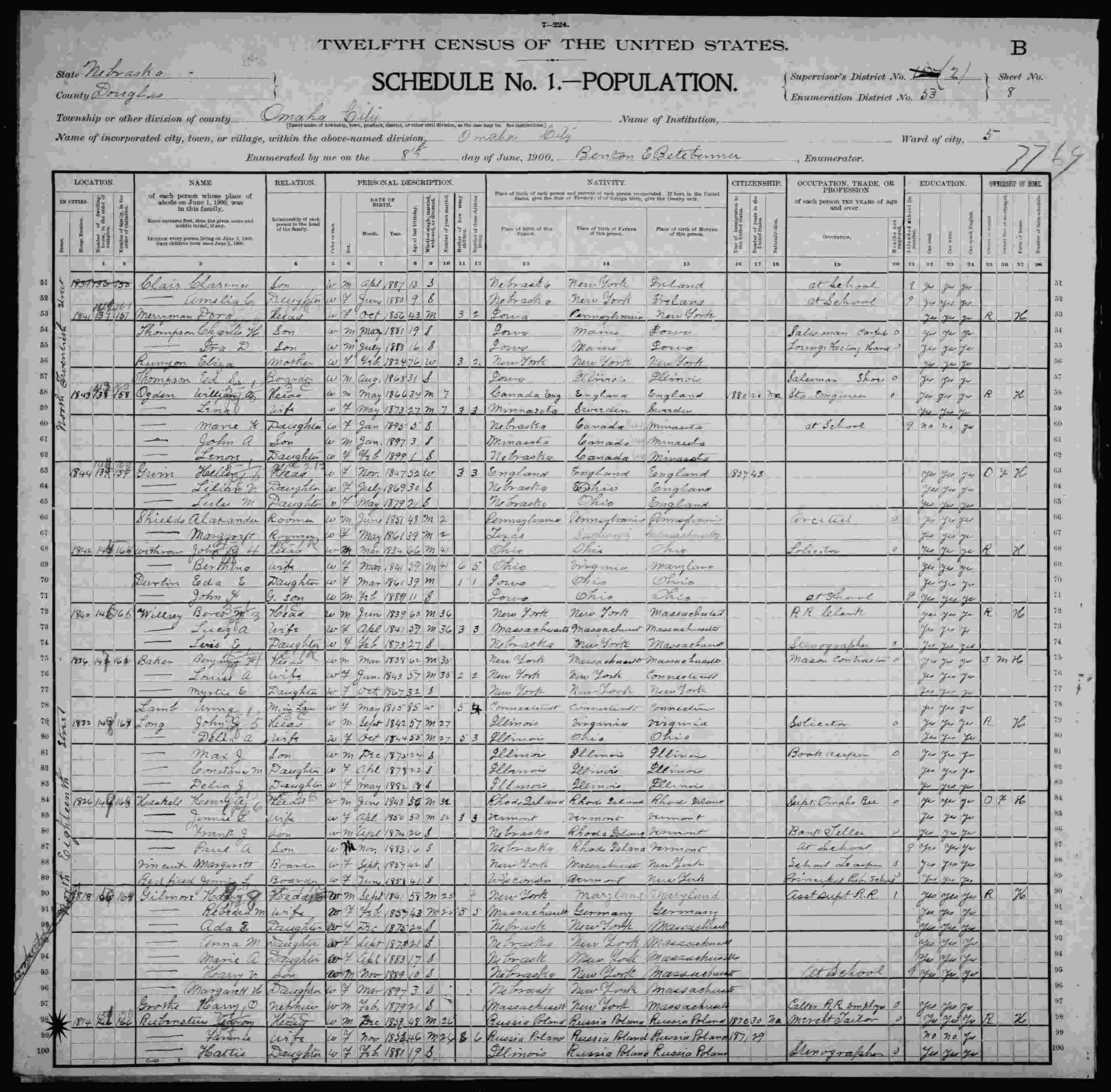 June 8, 1900 - 1814 North Eighteenth Street, ED 53, Precinct 5, Ward 5, Omaha, Douglas County, Nebraska.