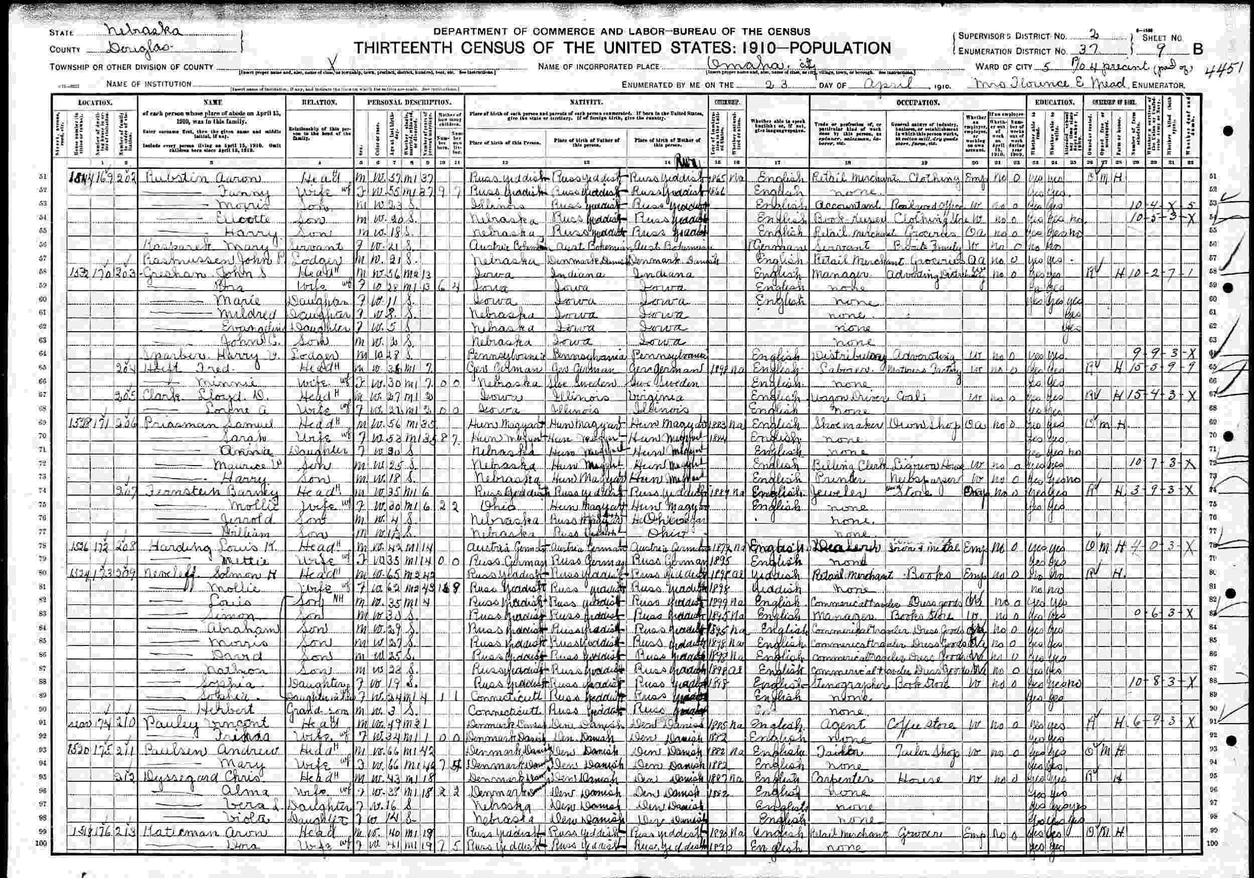 April 23, 1910 - 1544 N. 19, Ward 5, Supervisor's District 2, Enumeration District 37, Omaha, Douglas County, Nebraska.