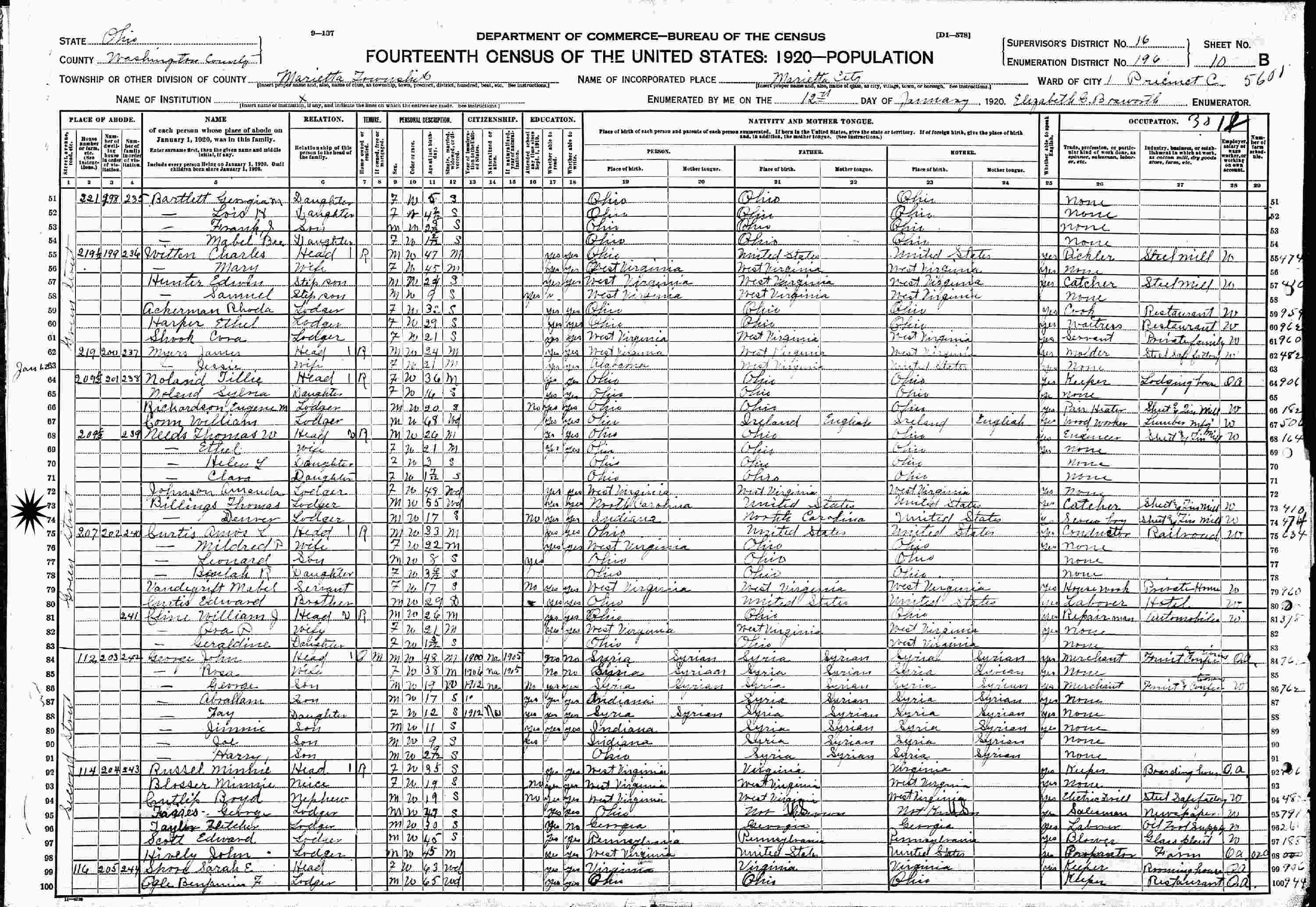 January 12, 1920 - 209 1/2 Green Street, Ward 1, Precinct C, Supervisor's District 16, Enumeration District 196, Marietta, Washington County, Ohio (lodger).