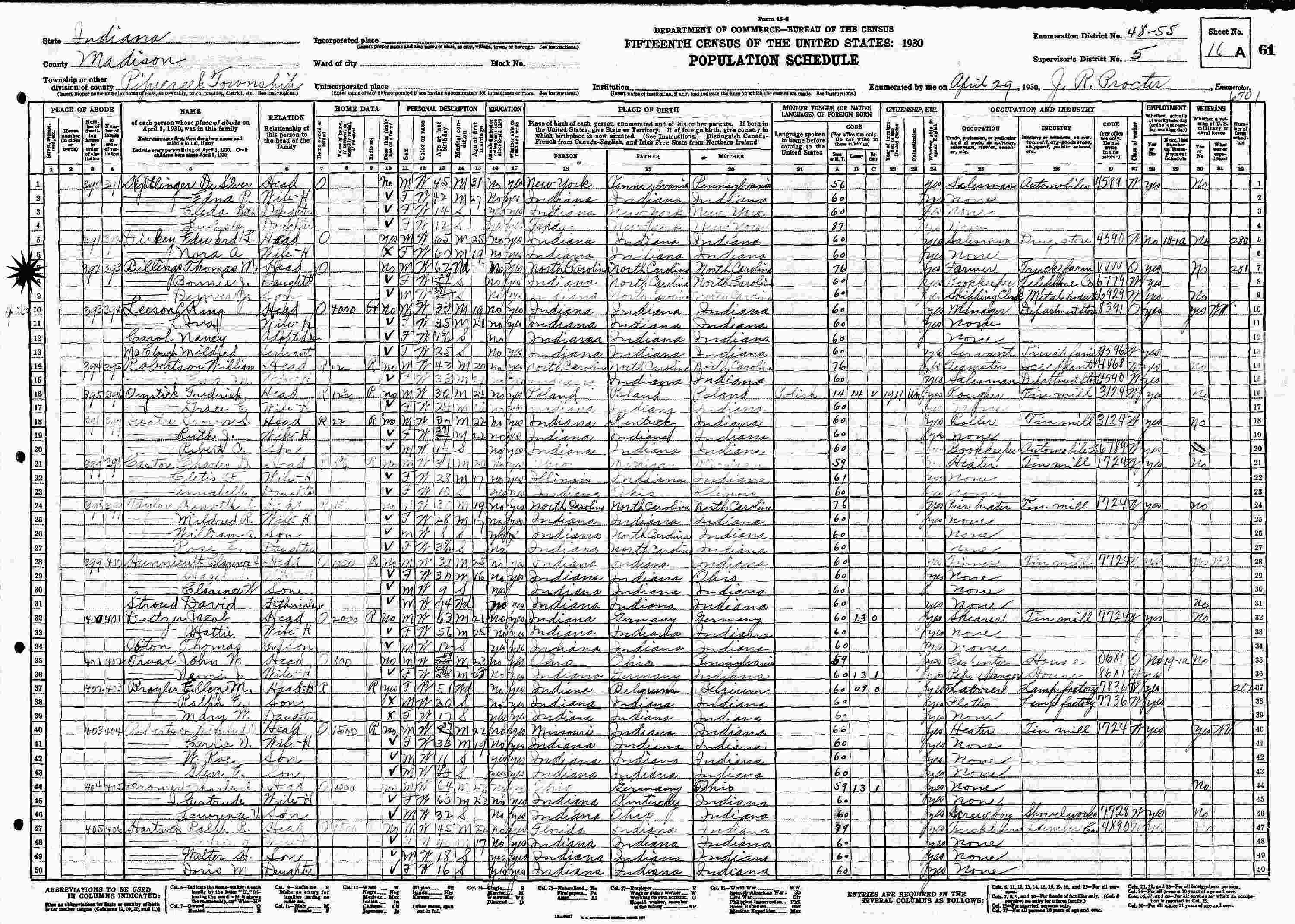 April 29, 1930 - Pipe Creek, Supervisor's District 5, Enumeration District 48-55, Madison County, Indiana.