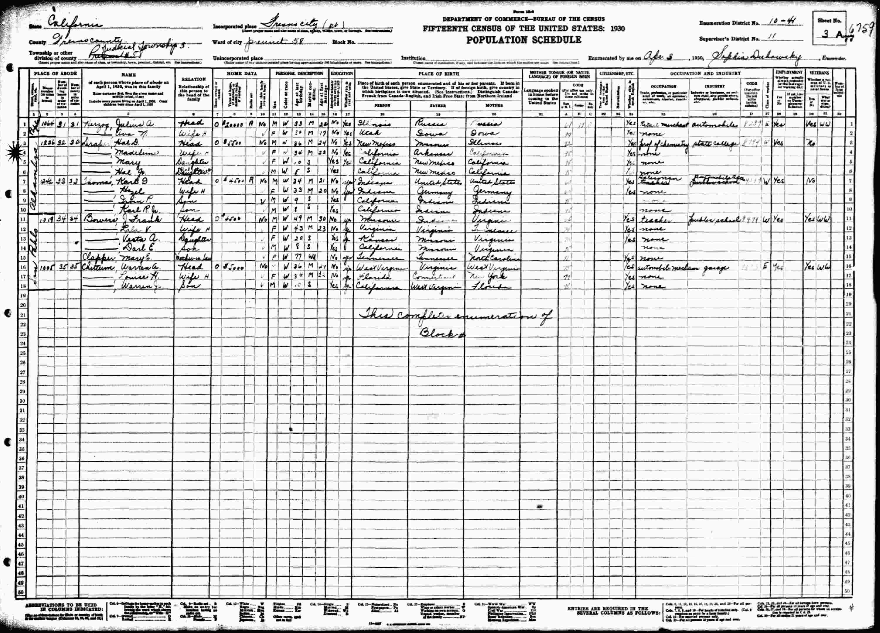 April 3, 1930 - Alhambra St?, Judicial Township 3, Fresno City, Precinct 58, Supervisor's District 11, Enumeration District 10-41, Fresno County, California.