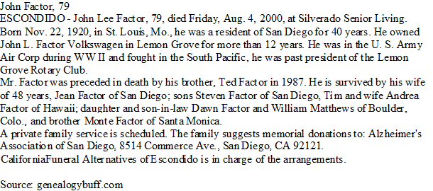 Died: August 4, 2000 in San Diego, San Diego County, California.