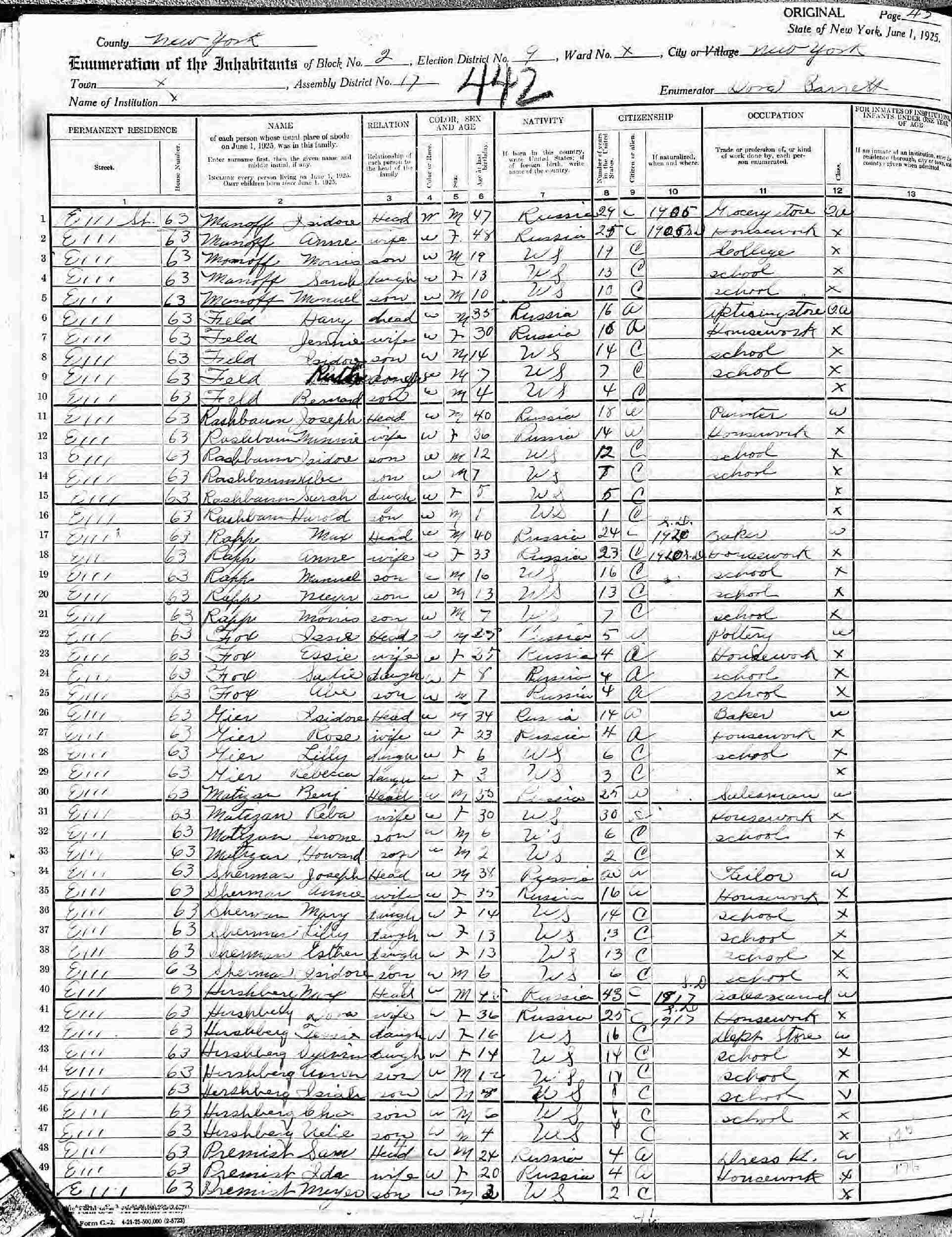 June 1, 1925 - New York State - 63 E 111 Street, Assembly District 17, Election District 9, Block 2, New York City, New York.