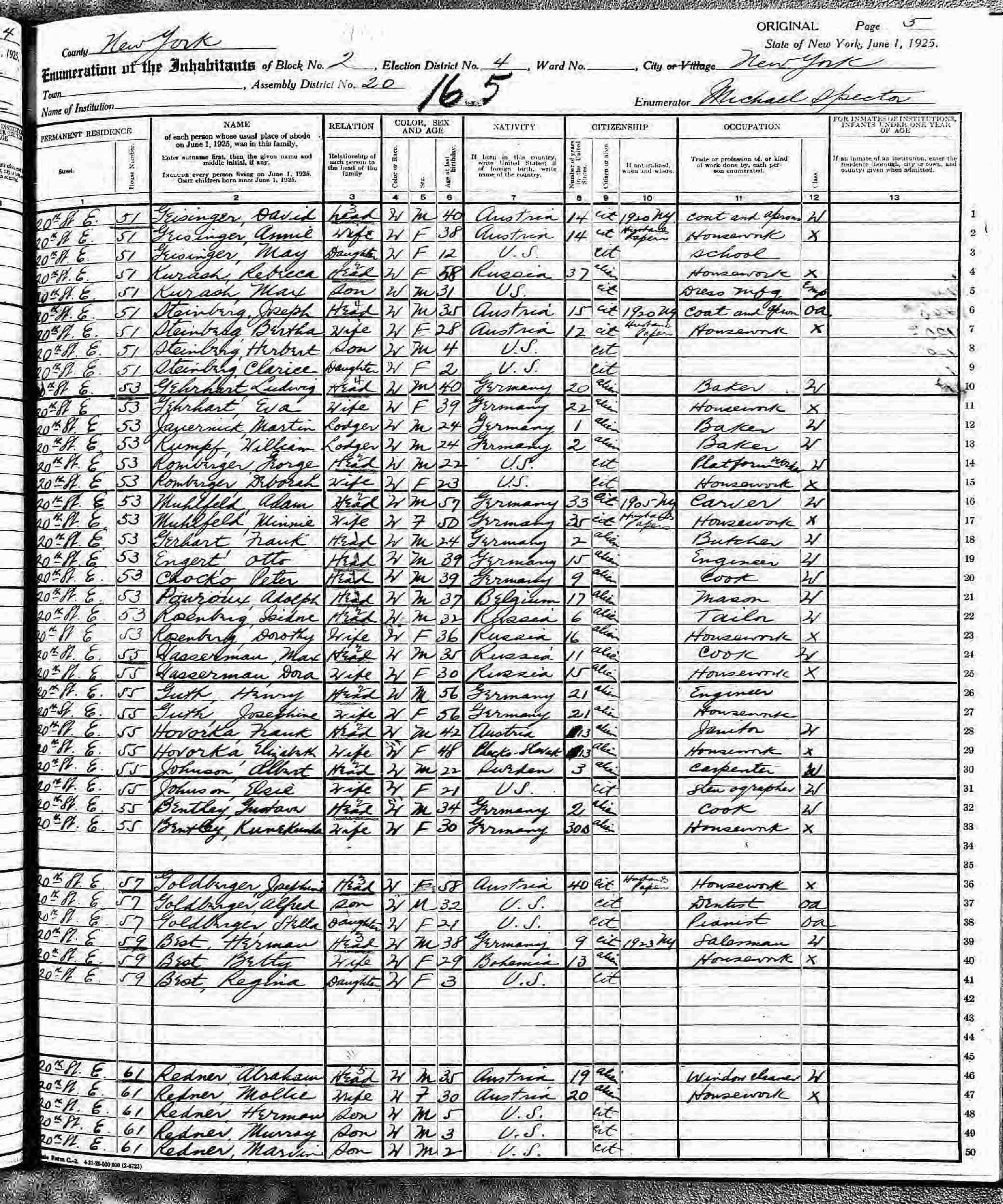 June 1, 1925 - New York State - 61 20th Street E, Block 2, Election District 4, Assembly District 20, New York, New York.