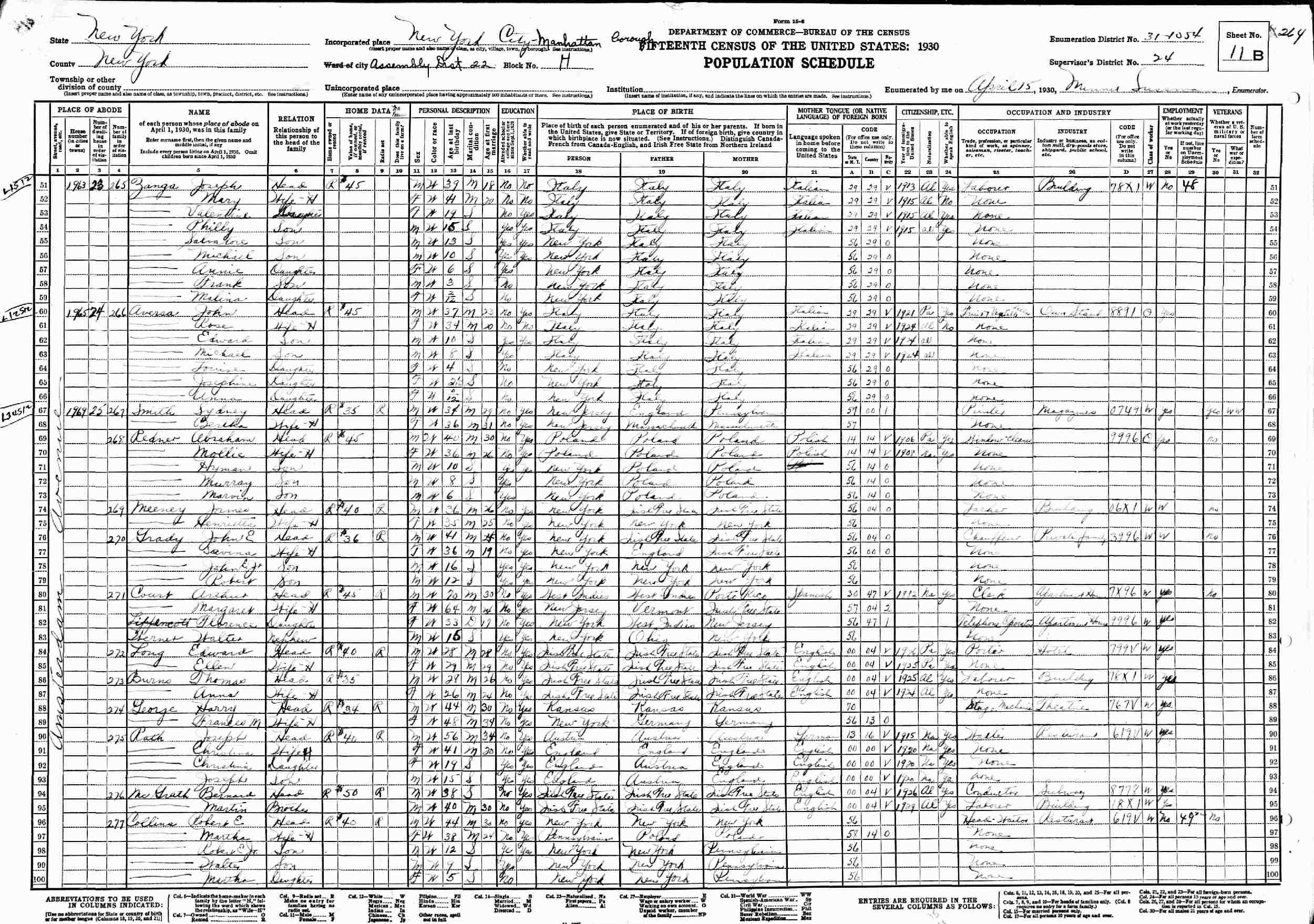 April 15, 1930 - 1969 Amsterdam Avenue, Assembly District 22, Block H, Supervisor's District 24, Enumeration District 31-1054, Manhattan, New York.