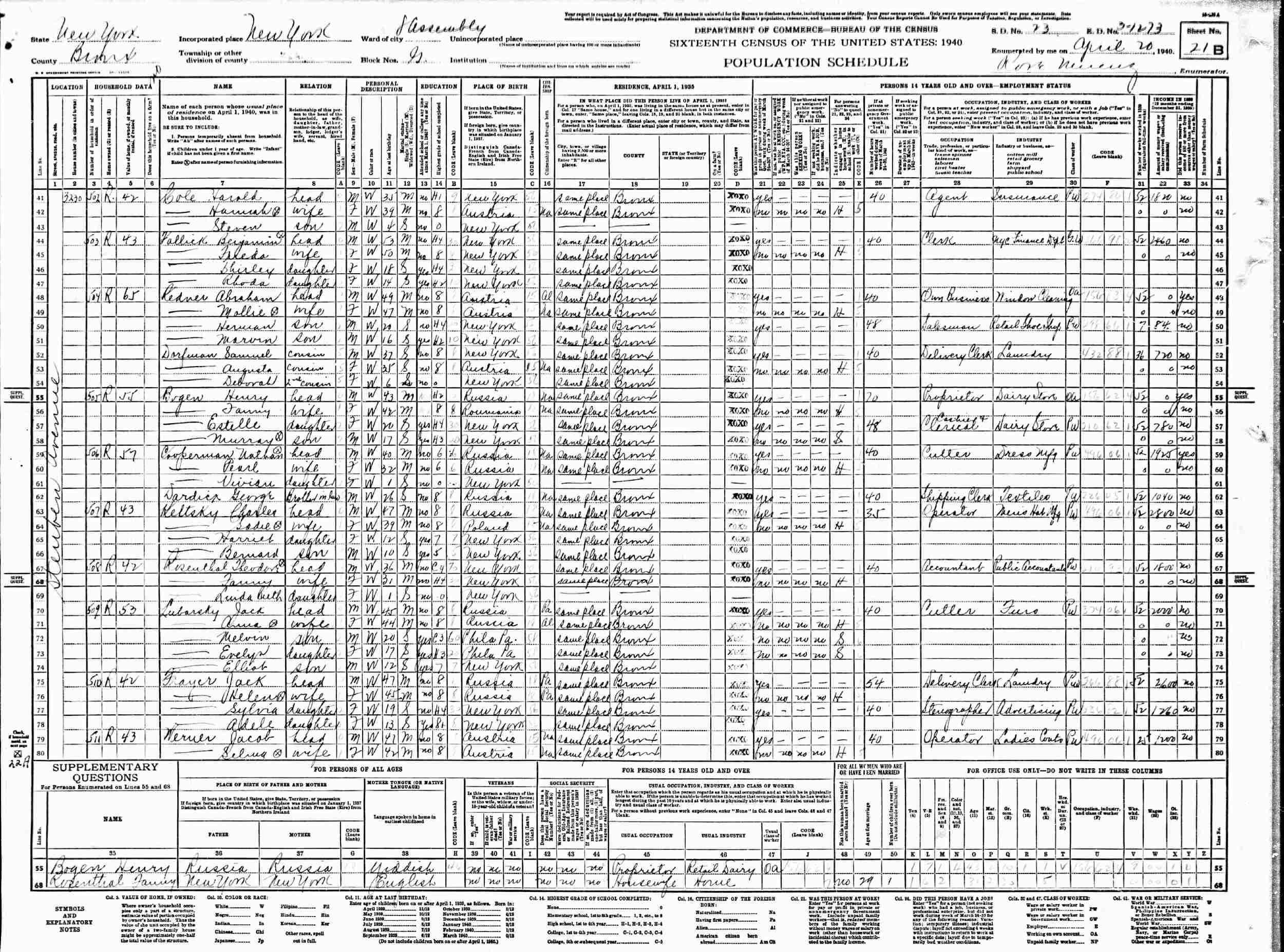 April 20, 1940 - 3230 Stueben Avenue, Assembly District 8, Block G, Supervisor's District 23, Enumeration District 3-1273, Bronx, New York.