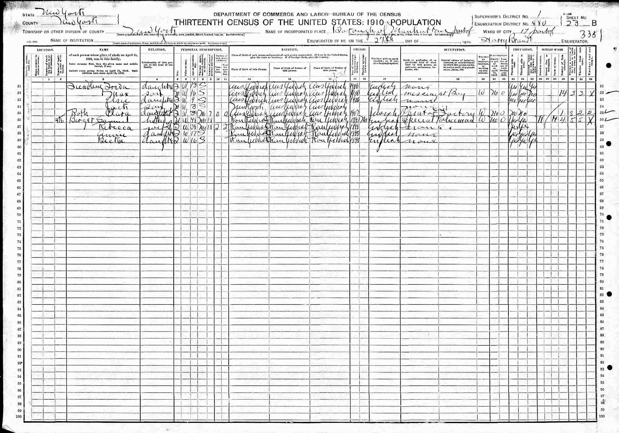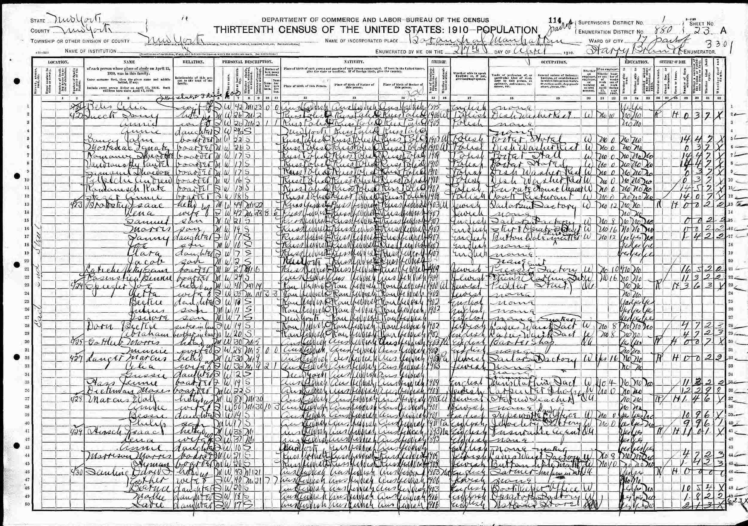 April 27, 1910 - East End Street, Ward 17, Supervisor's District 1, Enumeration District 880, Manhattan, New York.