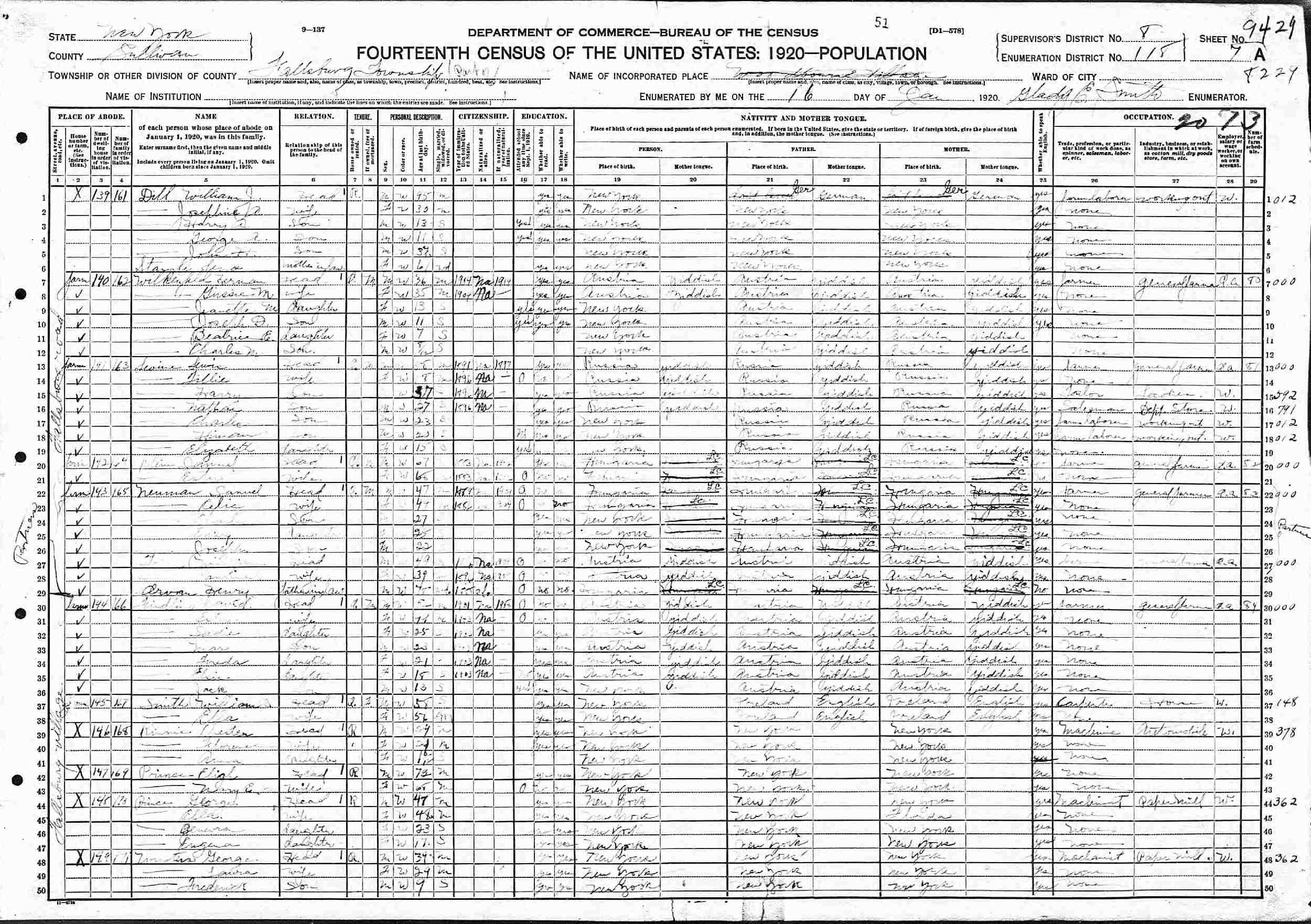 January 16, 1920 - Supervisor's District 8, Enumeration District 118, Fallsburg Villiage, Fallsburg, Sullivan County, New York.
