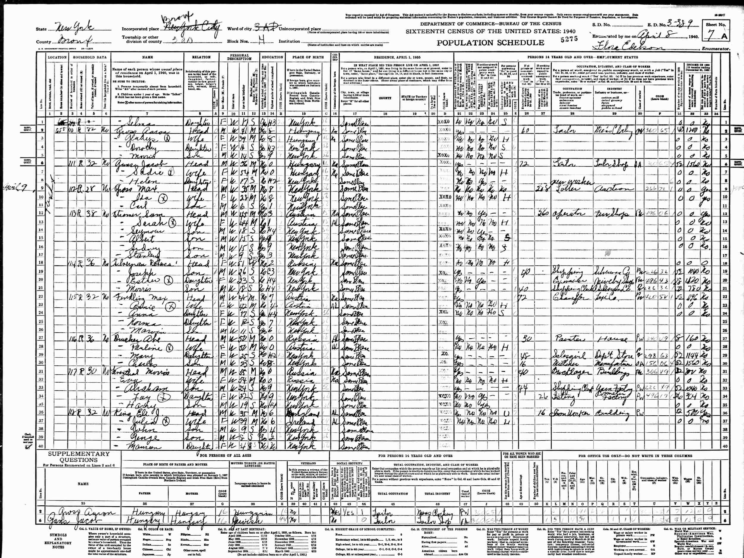 April 8-9, 1940 - 655 Fox Street, Assembly District 3, Block H, Enumeration District 3-389, Bronx, New York.