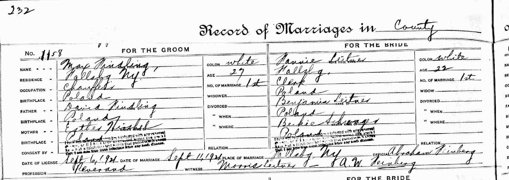 Married: Fannie Leitner September 11, 1921 in Fallsburg, Sullivan County, New York. (Marriage Certificate: #20861. Marriage License; September 9, 1921.)