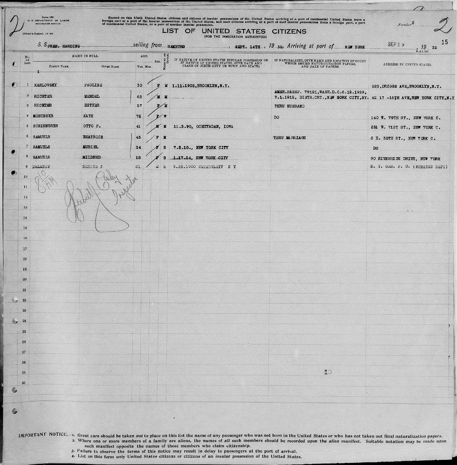 Ship Manifest September 14, 1932
