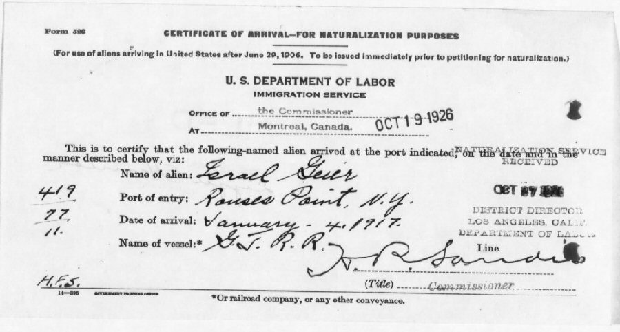 Naturalization: December 30, 1926 #18631 Los Angeles, California.