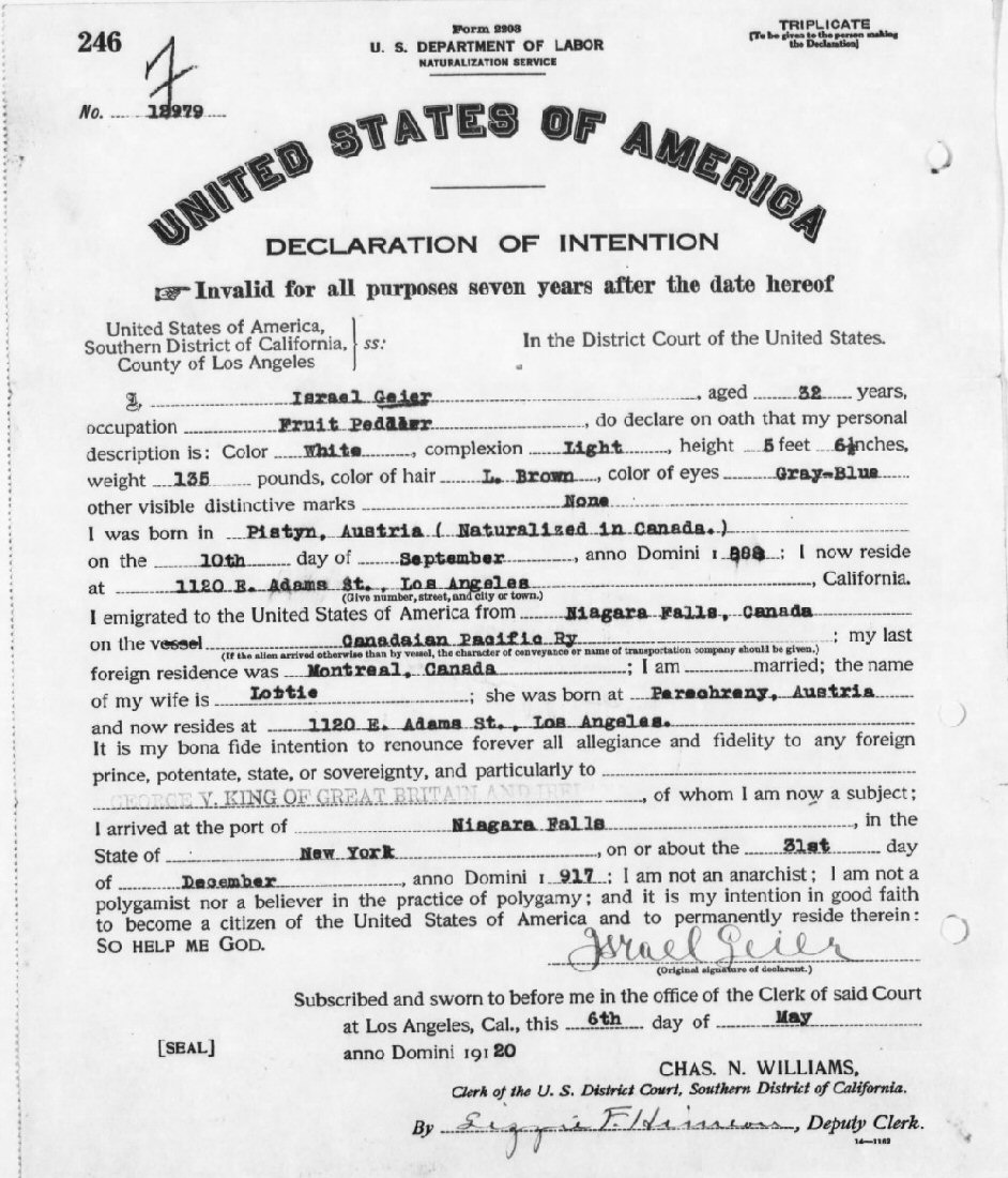 Declaration of Intention: May 6, 1920 - #12979 Los Angeles, California.