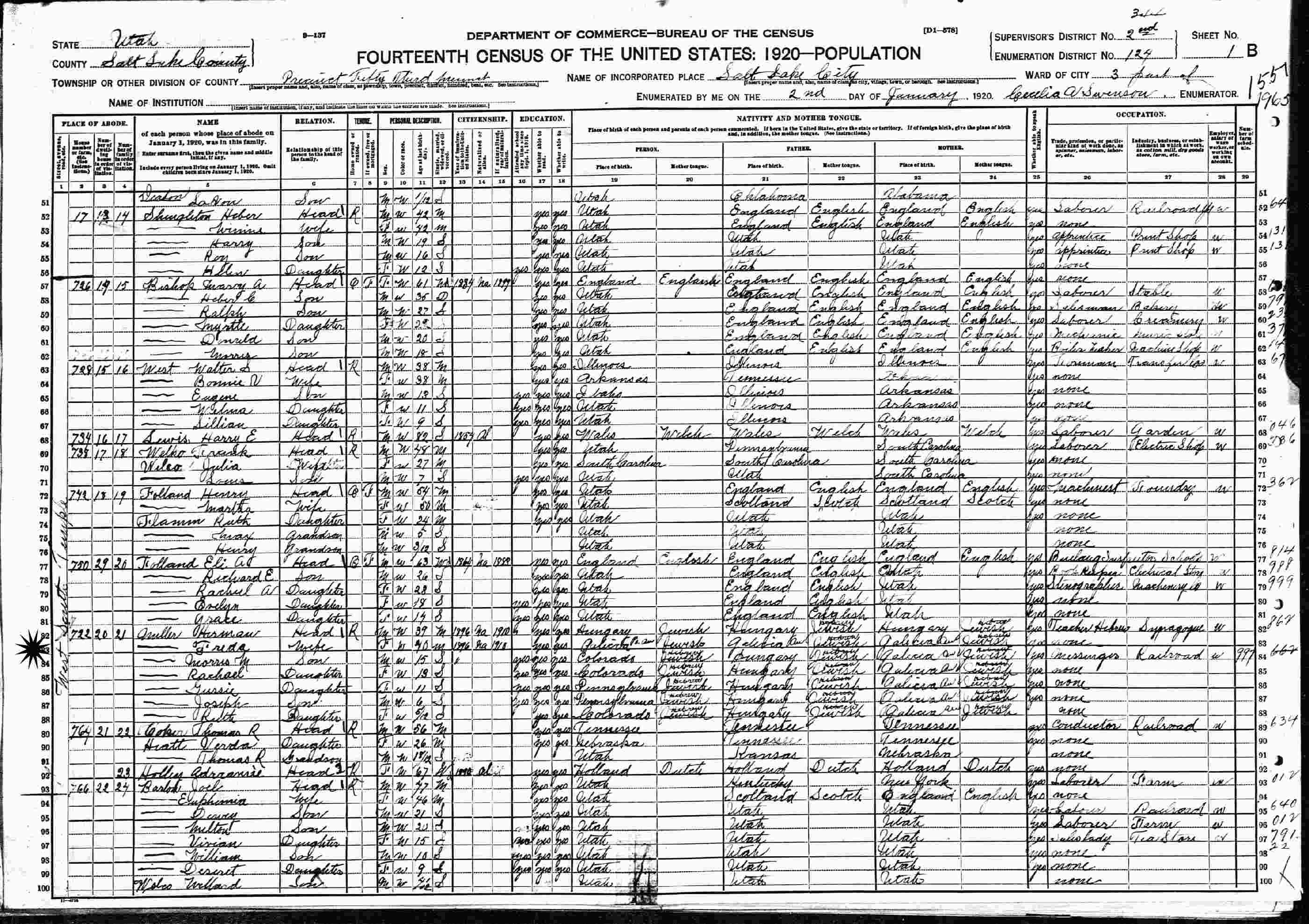 January 2, 1920: 722 West South Temple, Ward 3, Salt Lake City, Salt Lake County, Utah.
